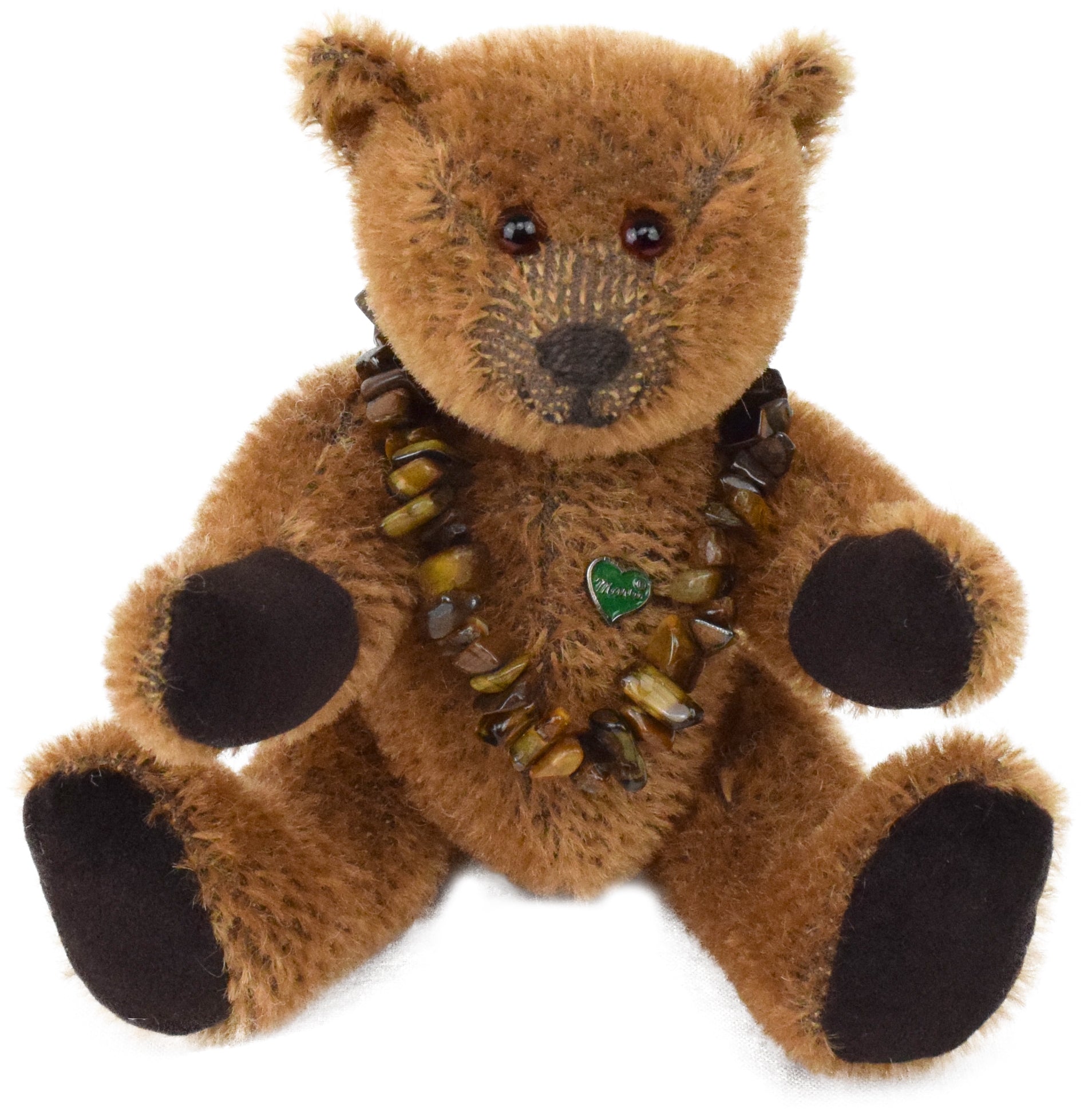 Ein 18cm vliesgefüllter Mohairteddy mit echtem Tigerauge als Glücksstein. Das Armband ist abnehmbar, so dass auch sie es tragen können.