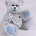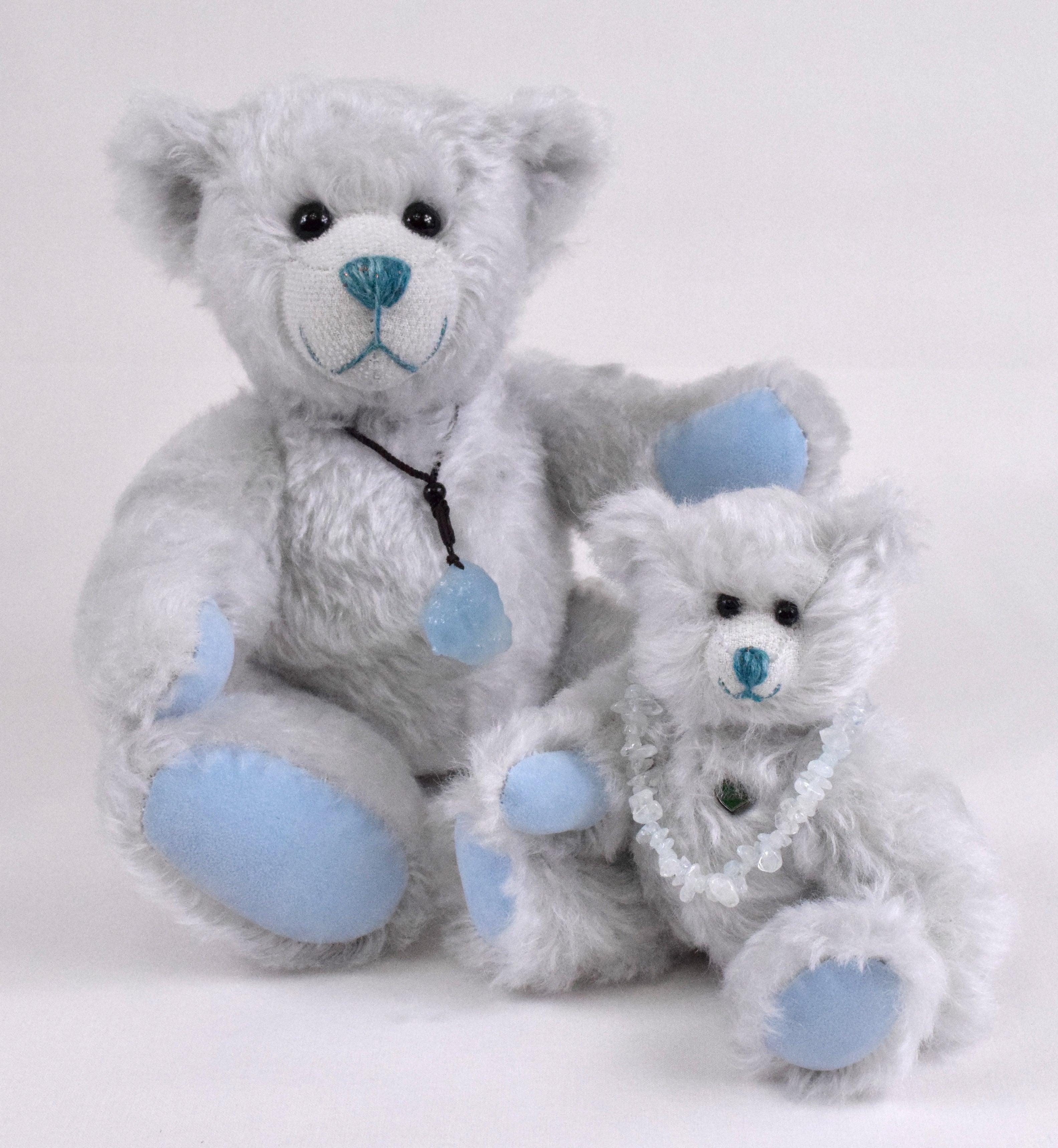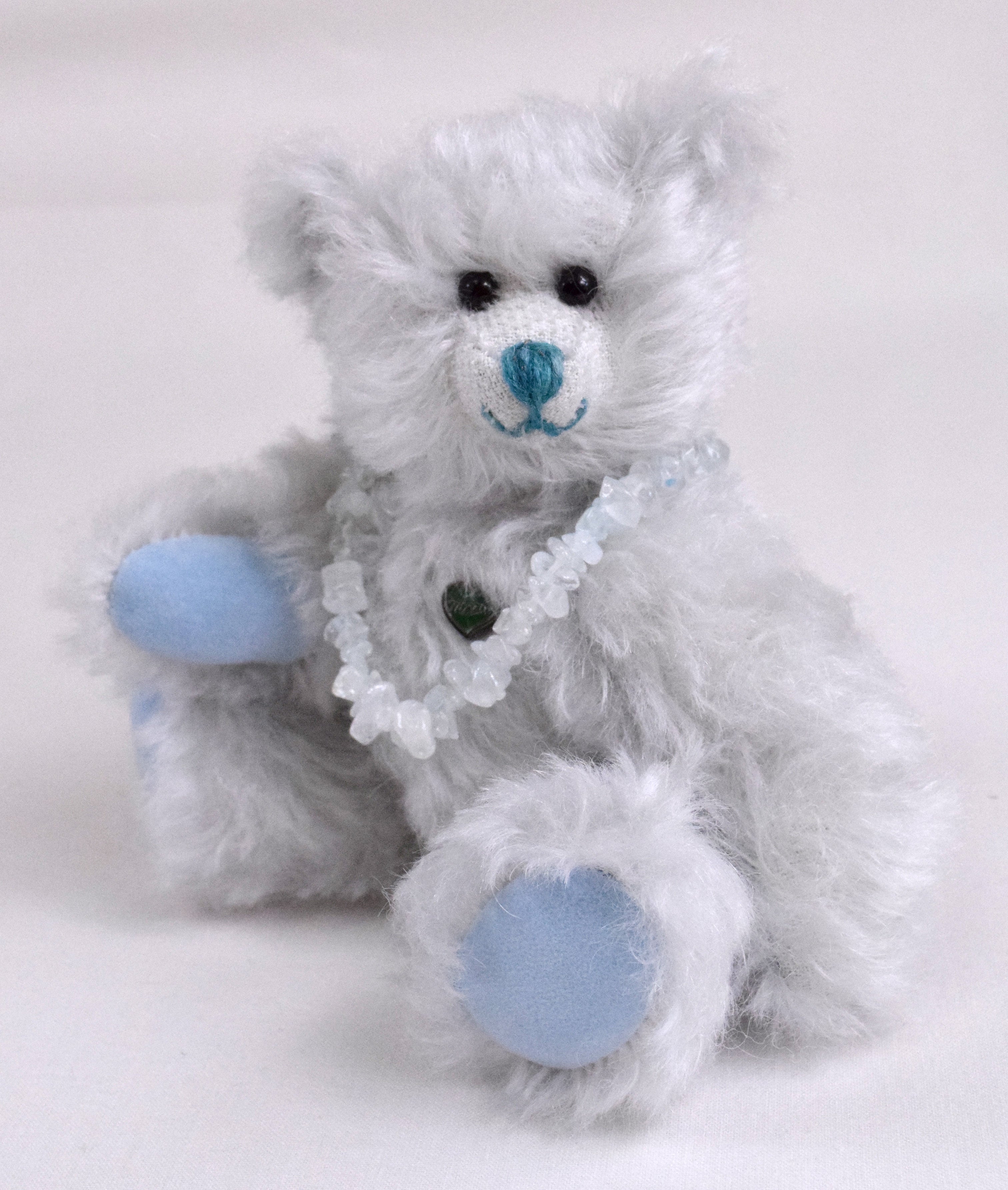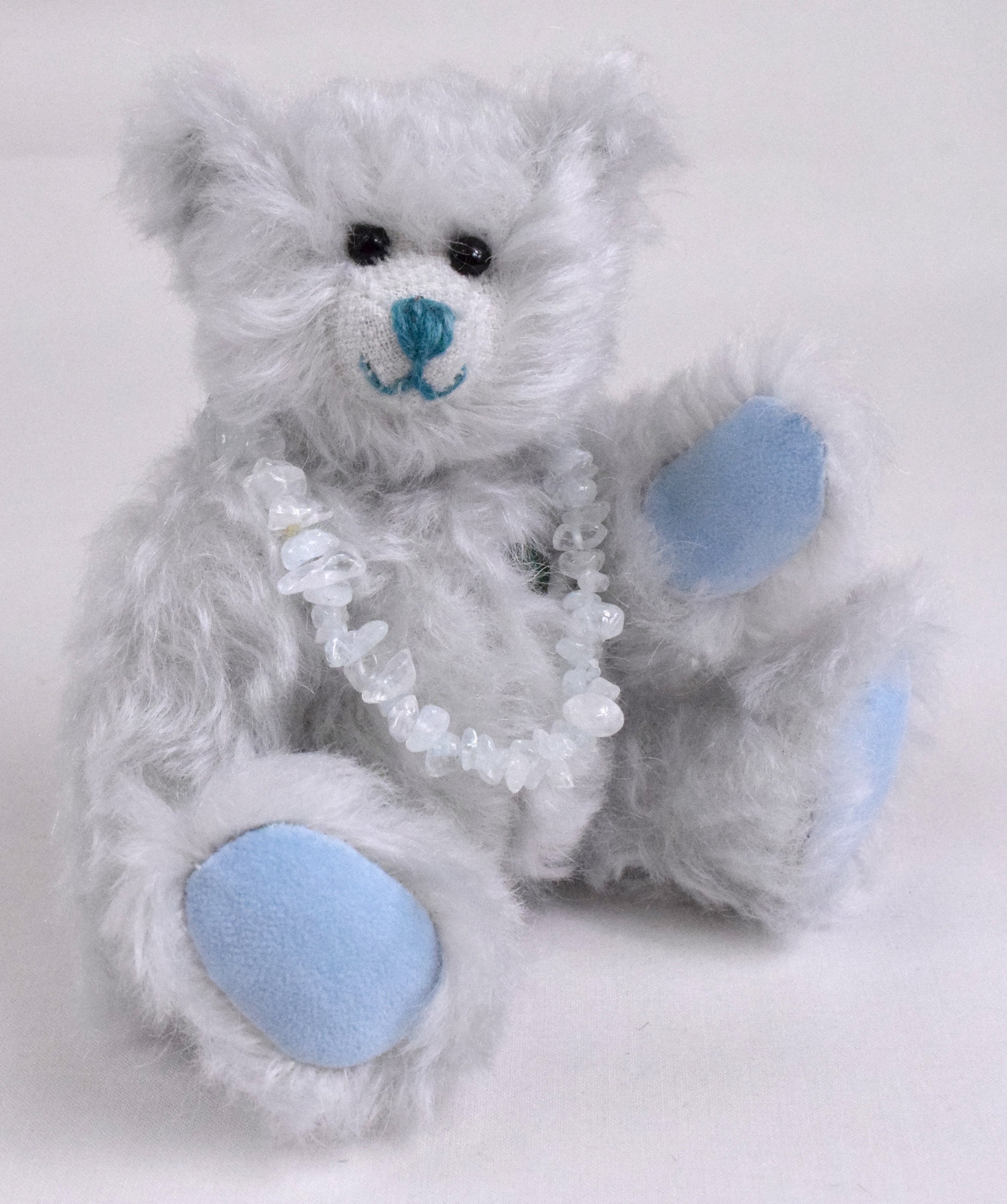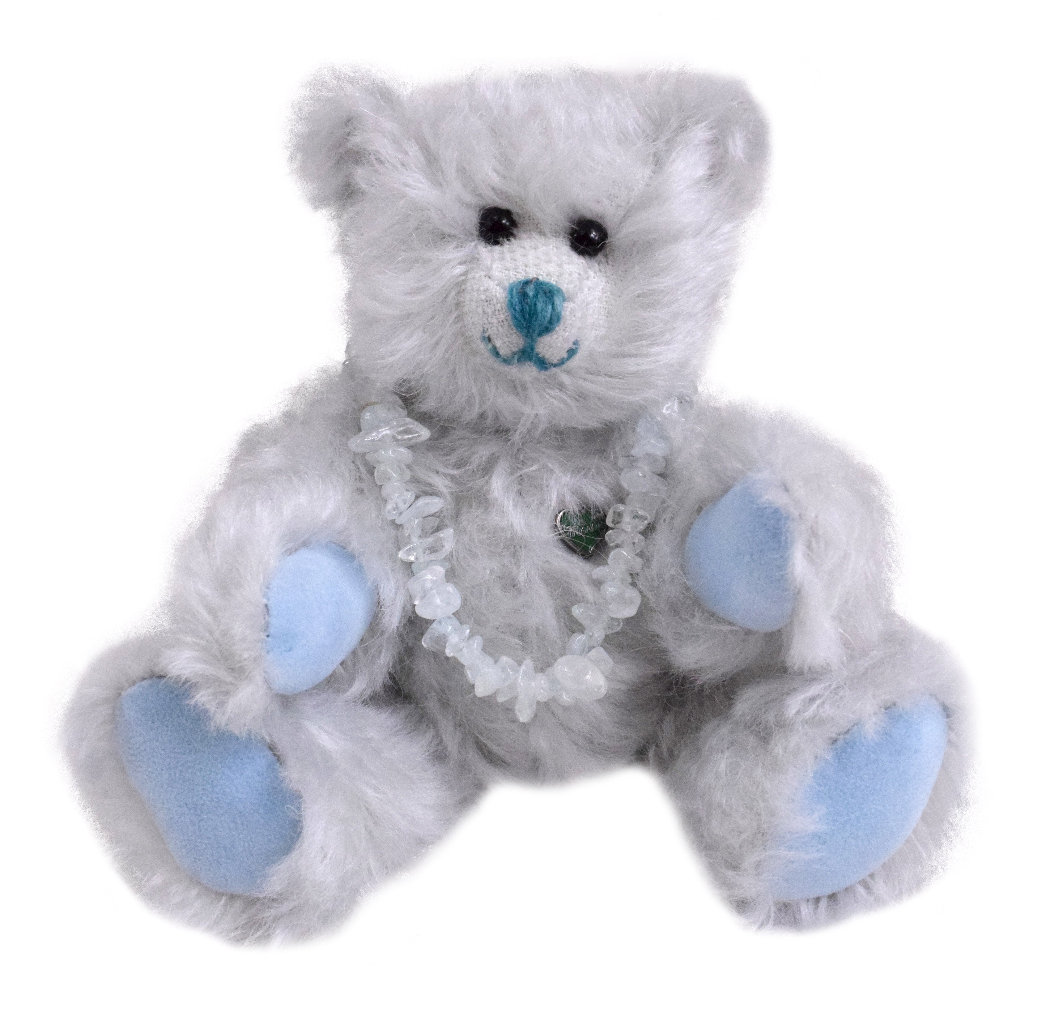 Ein 18cm vliesgefüllter Mohairteddy mit echtem Aquamarin-Armband. Das Armband ist abnehmbar, so dass auch sie es tragen können und nicht unbedingt an dem Teddy lassen müssen.