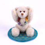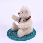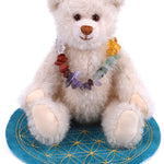 Yogini ist ein 17cm großes Bärchen aus weißem Mohair, das mit seinem lieben Lächeln Gelassenheit ausstrahlt. Um den Hals trägt es als Kette ein Chakraarmband in 7 verschiedenen Farben. Die Trommelsteinchen sind zwischen 7-9 mm groß. Jedem Chakra wird ein Stein zugeordnet: Kronenchakra-Bergkristall, Stirnchakra-Amethyst, Halschakra-Sodalith, Herzchakra-Grüner Aventurin, Solarplexuschakra-Citrin, Sakralchakra-Karneol, Wurzelchakra-Granat.