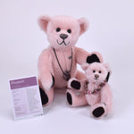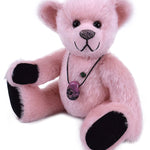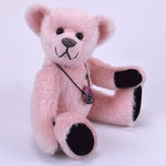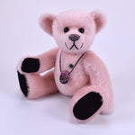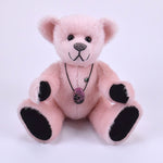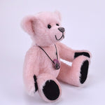 Mit seinen schwarzen Sohlen und Pfoten bildet der Teddy einen wunderschönen Kontrast zum zarten, hellrosa Mohair – eine elegante Kombination, die ihn zu einem echten Blickfang macht.