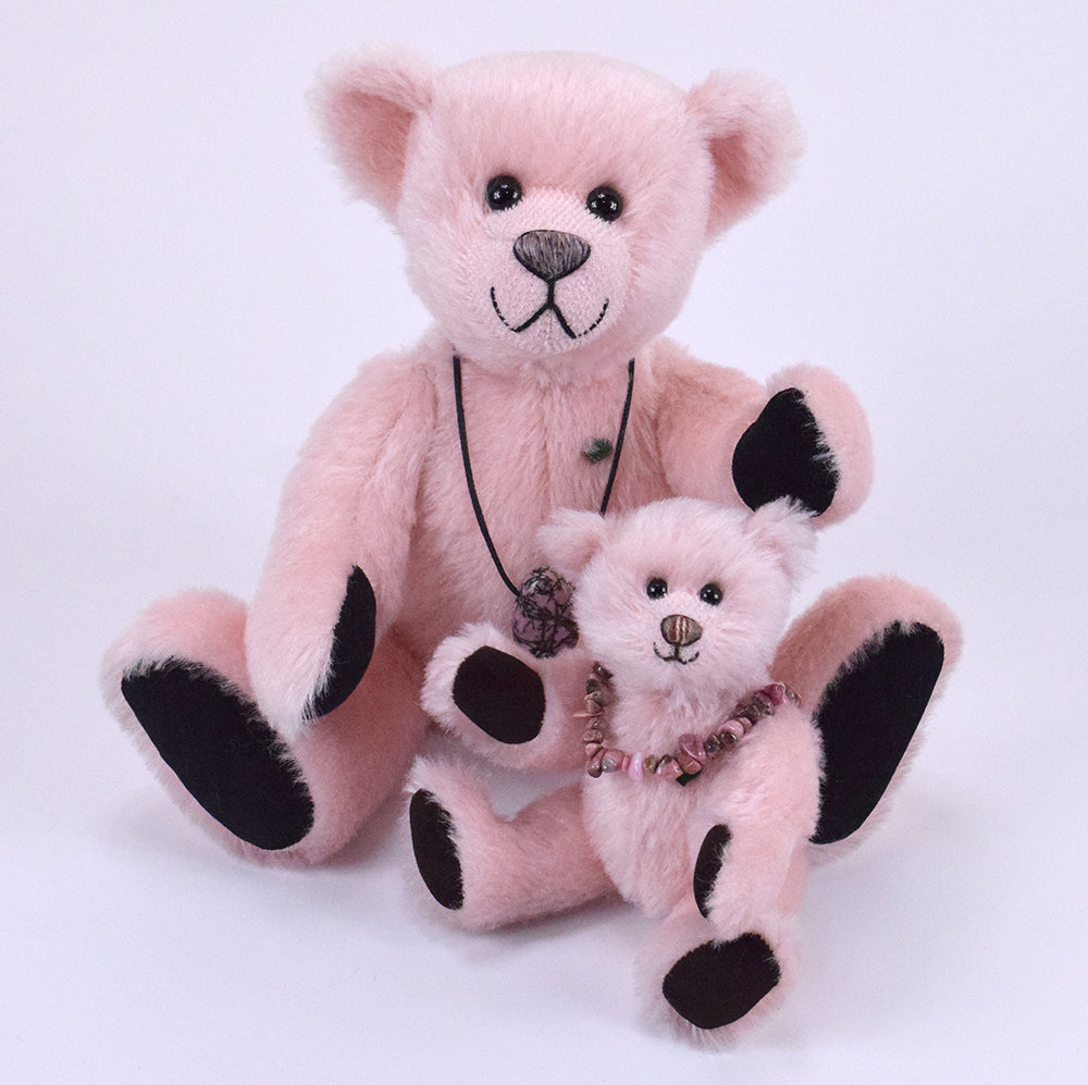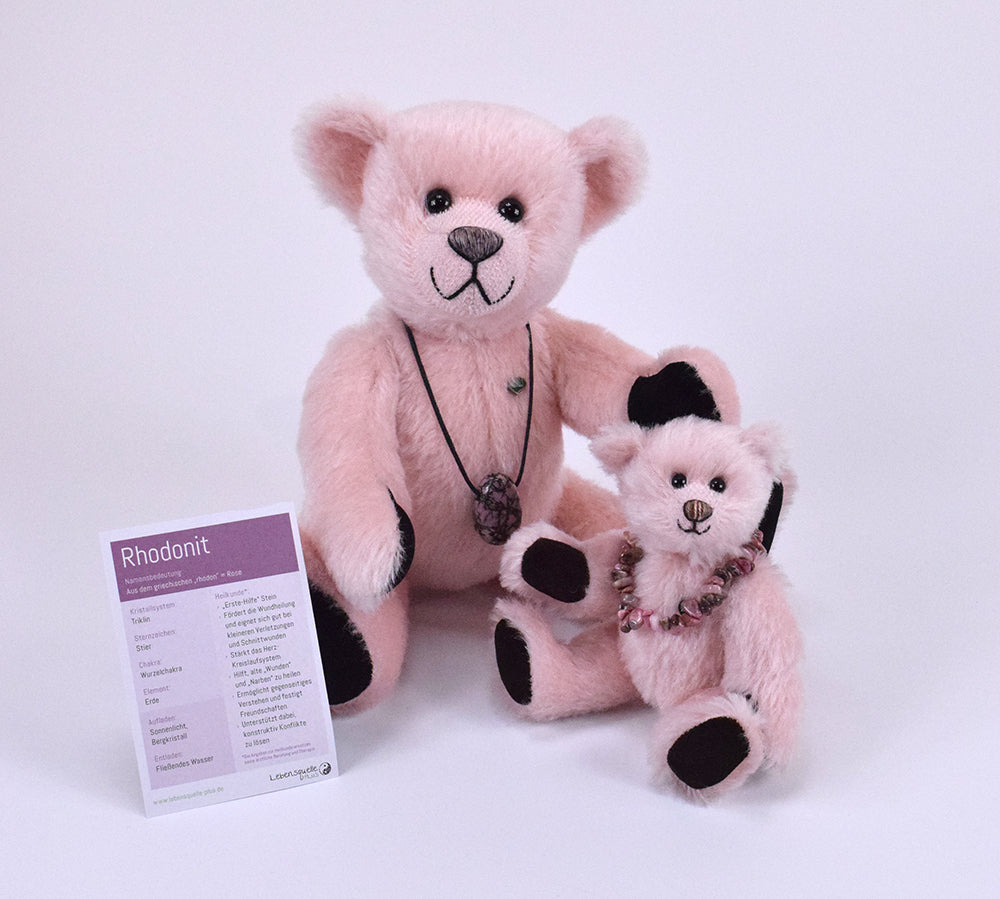 Dieser besondere 30 cm große Mohairteddy ist mit weichem Vlies gefüllt und trägt einen echten, rosafarbenen Rhodonit-Anhänger – ein Unikat aus 100 % Edelstein. Die abnehmbare Kette macht den Anhänger zu einem vielseitigen Schmuckstück, das auch separat getragen werden kann. Da jeder Stein in seiner Form variiert, ist jedes Exemplar einzigartig.