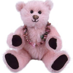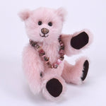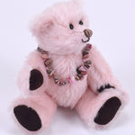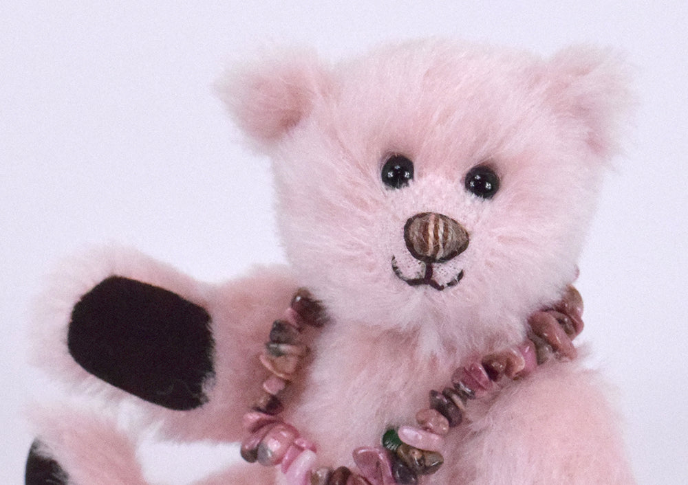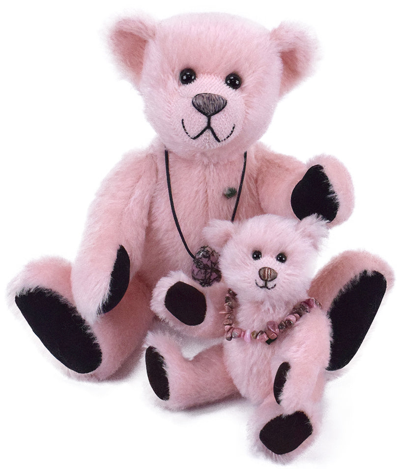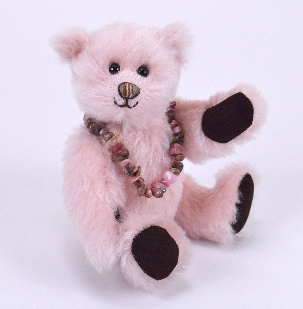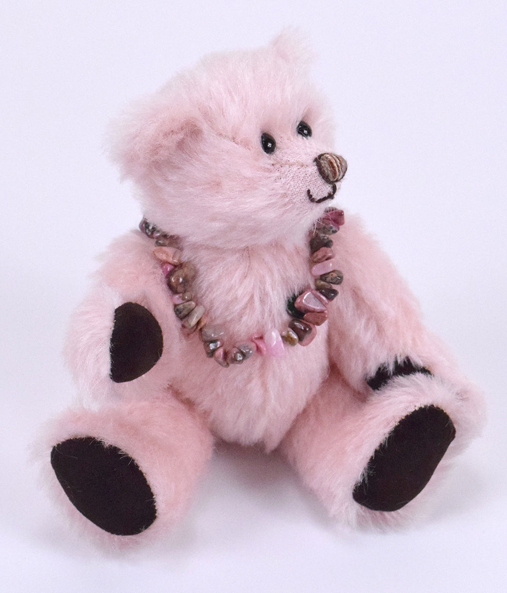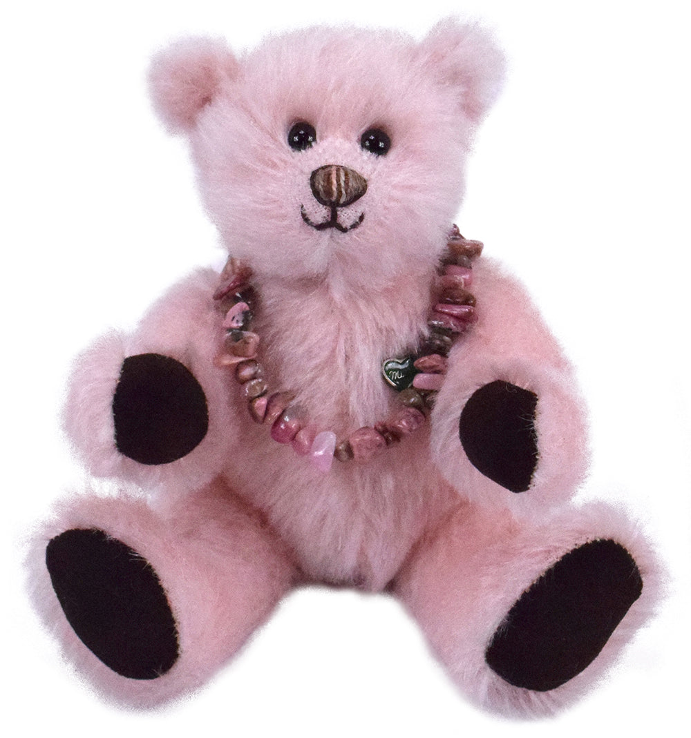 Dieser besondere 18 cm große Mohairteddy ist mit weichem Vlies gefüllt und trägt einen echten, rosafarbenen Rhodonit-Anhänger – ein Unikat aus 100 % Edelstein. Die abnehmbare Armband ist ein schönes Schmuckstück, das auch separat getragen werden kann. Da jeder Stein in seiner Form variiert, ist jedes Exemplar einzigartig.