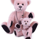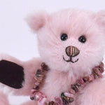 Mit seinen schwarzen Sohlen und Pfoten bildet der Teddy einen wunderschönen Kontrast zum zarten, hellrosa Mohair – eine elegante Kombination, die ihn zu einem echten Blickfang macht.