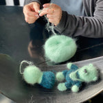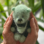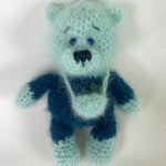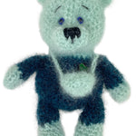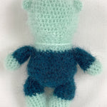 Dieser Häkelteddy ist aus besonderer mint- und petrolfarbener Wolle gehäkelt, die aussieht, als ob er total flauschiges Fell hat. Markant bei diesem Teddybär sind seine zum Teddy-T gestickte Nase und die Augenbrauen, die ihn diesen niedlichen Blick verleihen. Um den Hals trägt dieser kleine Teddybär eine gehäkelte, mintfarbene Tasche für all seine Habseligkeiten.