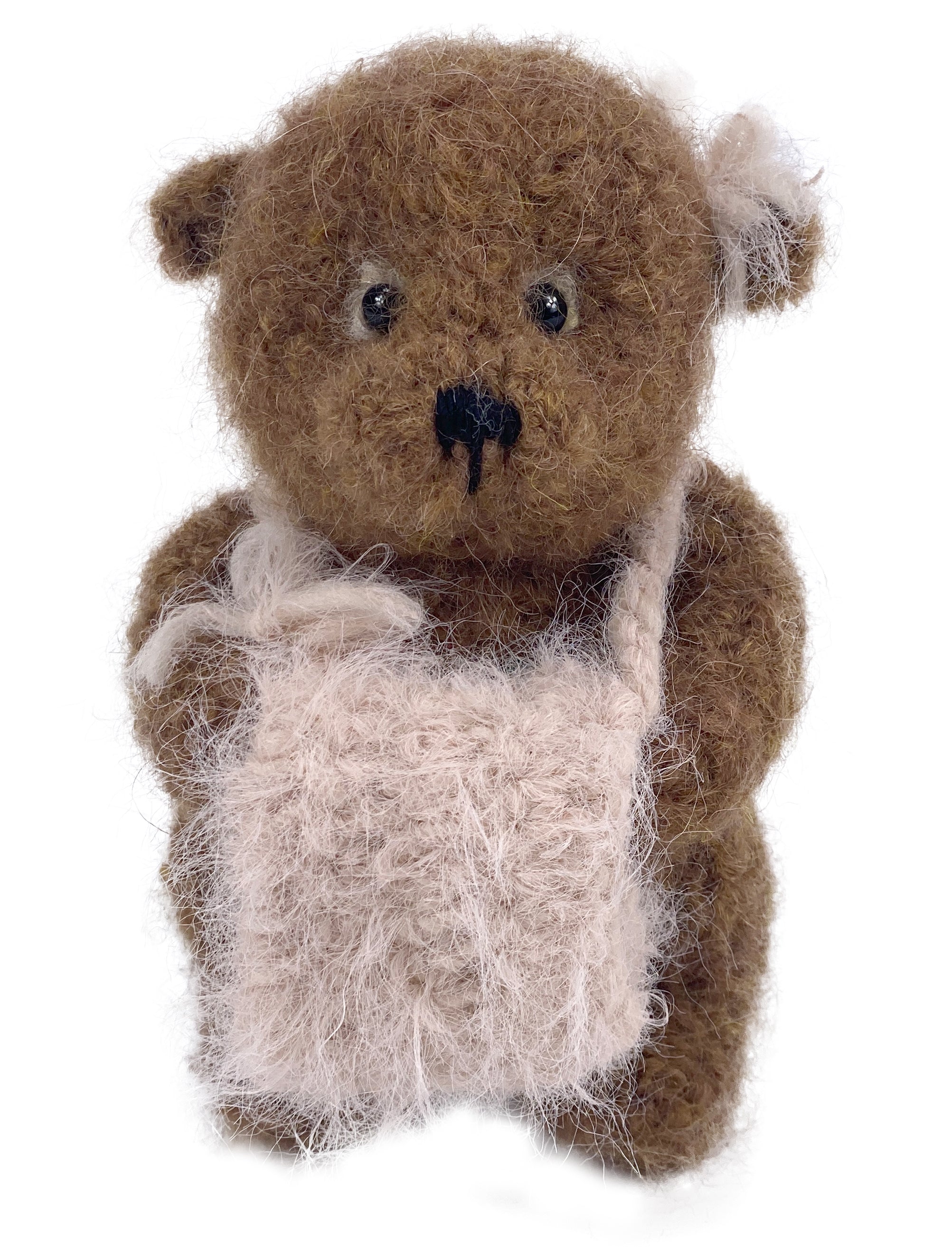 Maffi wird aus weicher, brauner Babyalpakawolle gehäkelt und überzeugt durch ihre zarte, flauschige Textur, die zum Kuscheln und Liebhaben einlädt. Die liebevollen Details machen sie besonders: Ein cremefarbener Muff, ebenfalls gehäkelt, verleiht ihr einen einzigartigen und eleganten Look.