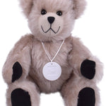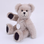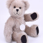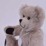 Der Teddybär hat hellgraues Mohairfell sowie eine Brummstimme. Die Sohlen und Pfoten sind aus schwarzem Waschleder gefertigt. Das Schnäuzchen ist mit schwarzem Garn zu einem lieben Lächeln gestickt.