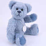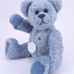 Der Teddybär hat blaues Mohairfell sowie eine Brummstimme. Das Schnäuzchen ist mit Garn in verschiedenen Blautönen gestickt.