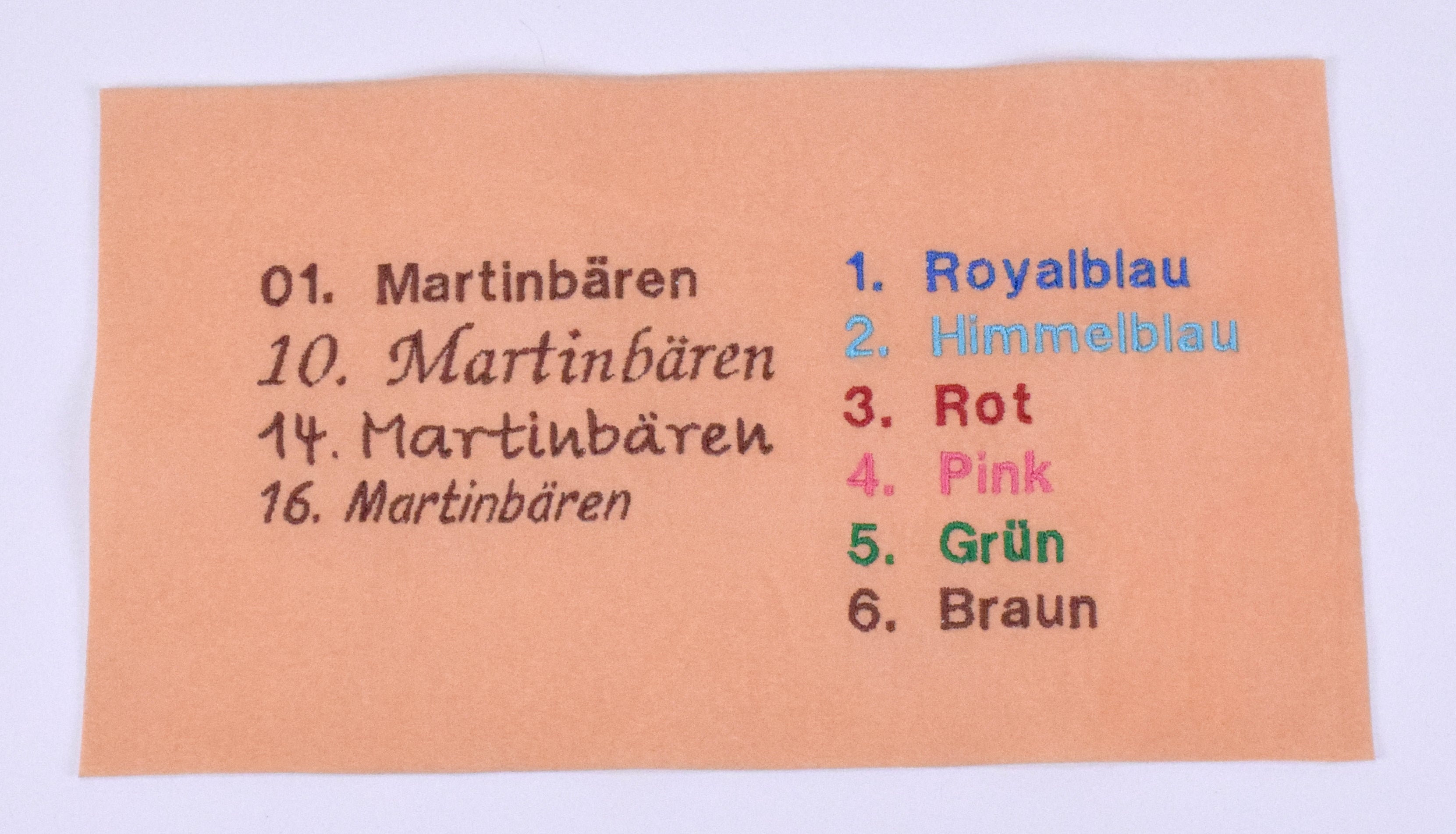Beide Sohlen können mit max. 8 Zeichen pro Zeile bestickt werden z.B. mit Namen, Geburtsdatum, Sternzeichen oder auch Symbol. Individuelle Bestickung ist standardmäßig in der Farbe Braun - kann auf Wunsch auch eine andere Farbe sein! Bitte wählen Sie Farbe und Schrift anhand der Aufstellung.