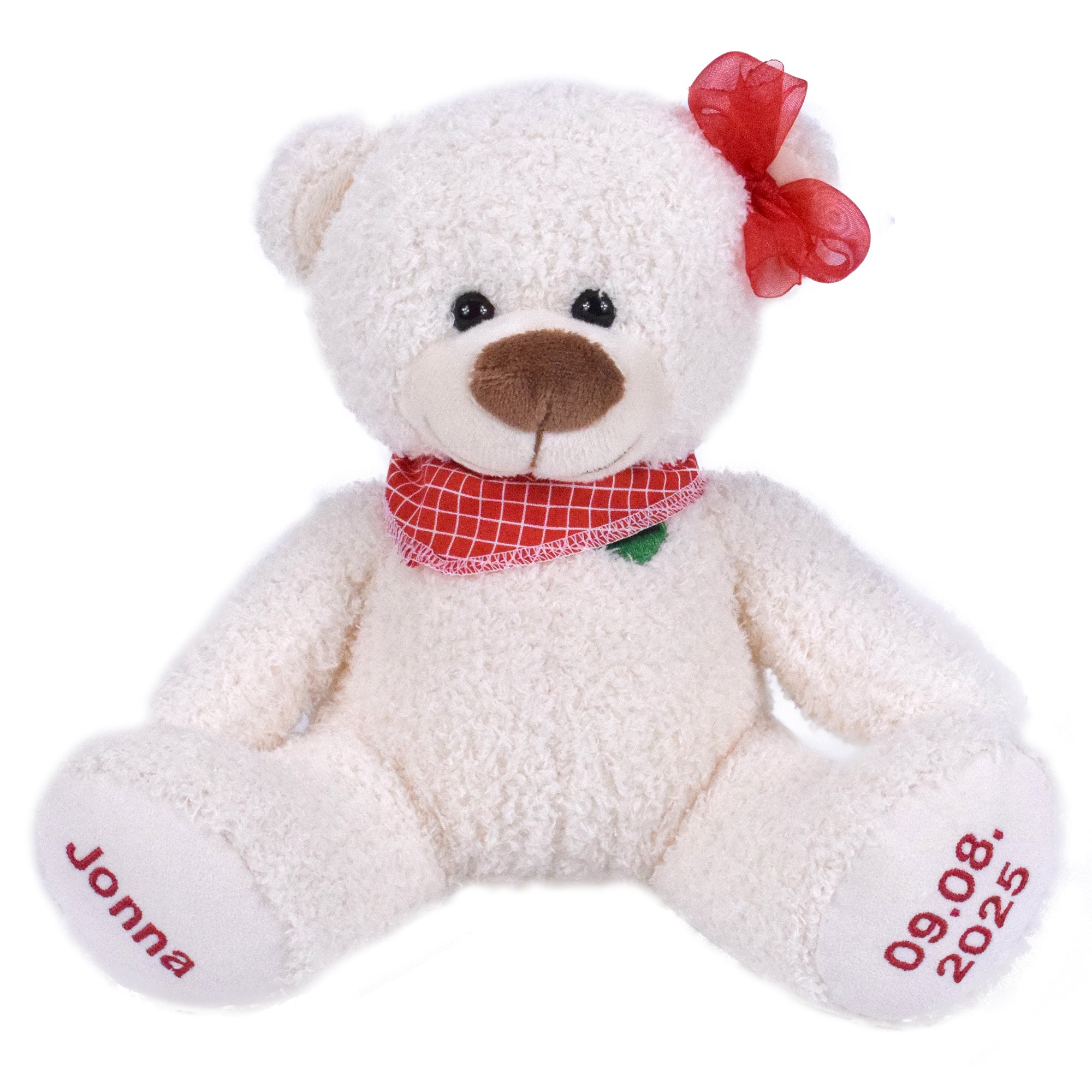 Unser weißer, 25 cm großer Kuschelteddy ist kindgerecht, waschbar und mit der individuellen Bestickung ein persönliches und einmaliges Geschenk - zur Geburt oder auch für andere schöne Lebensereignisse wie Taufe oder Geburtstag. Er hat ein freundliches Lächeln, ein gesticktes Martinherz auf der linken Brust und trägt ein rotes Tuch mit weißen Punkten sowie eine rote Schleife.