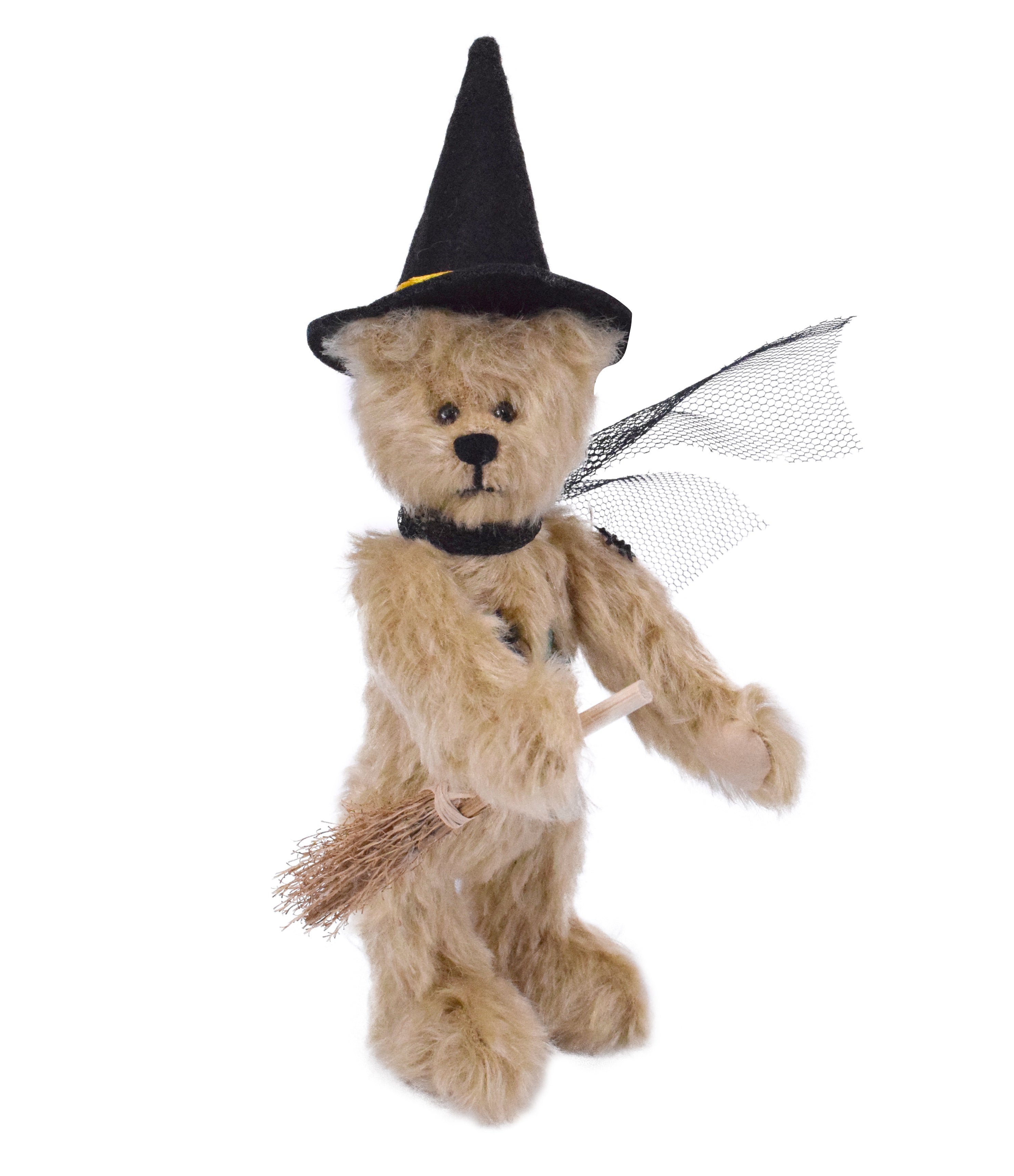 Gefertigt aus edlem Mohair und liebevoll von Hand gearbeitet, trägt er einen schwarzen, spitzen Filzhut, der ihm einen geheimnisvollen Charme verleiht. Sein zarter Tüllschal und der kleine Hexenbesen sind weitere Accessoires, die sein Erscheinungsbild abrunden und ihn unverwechselbar machen.