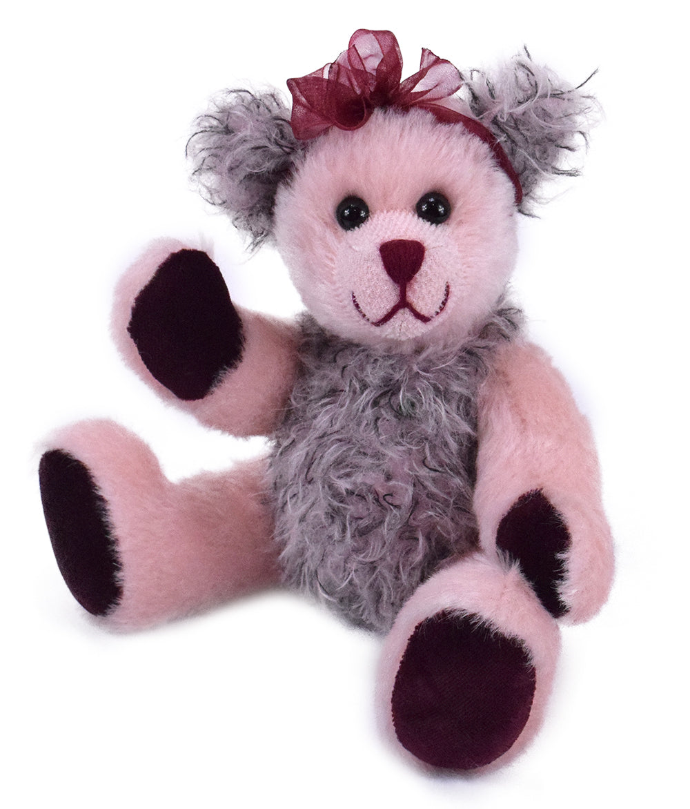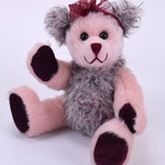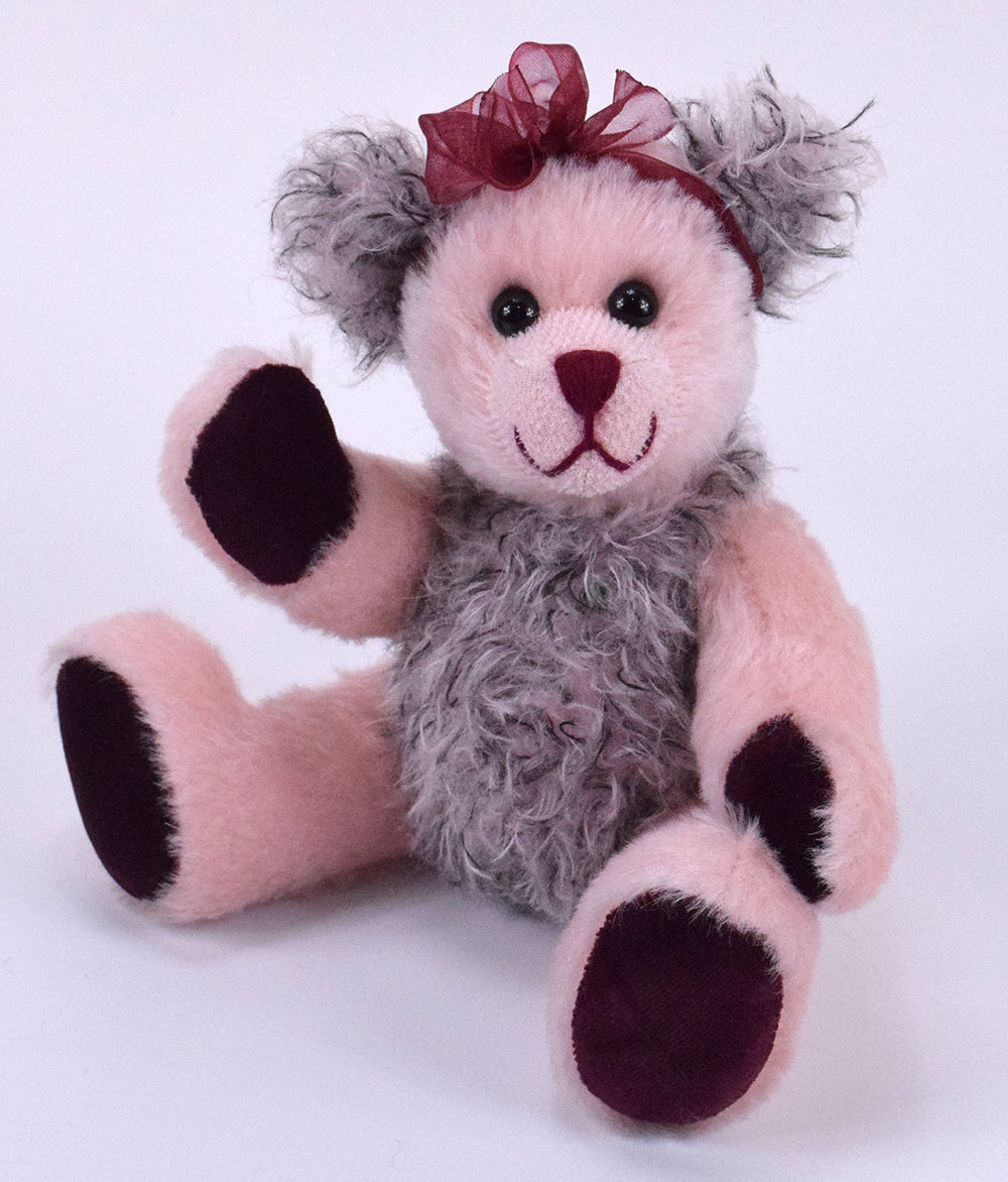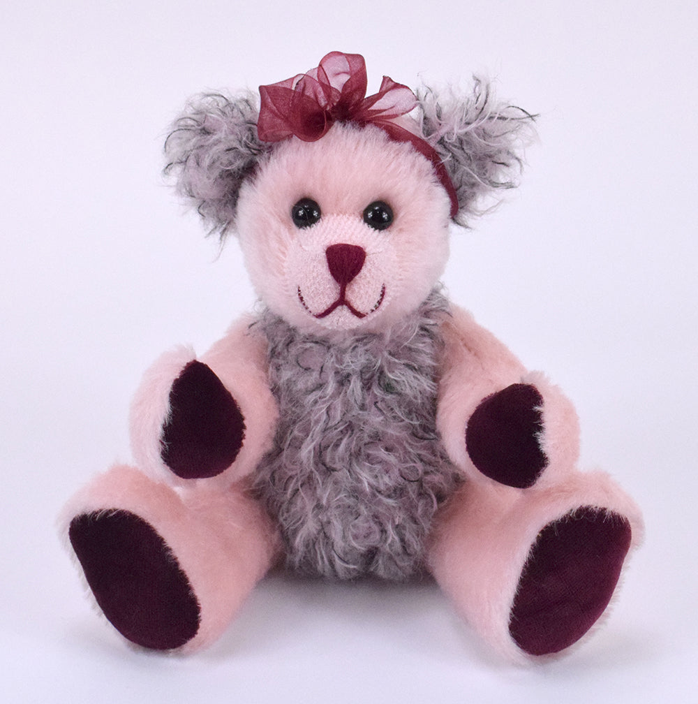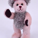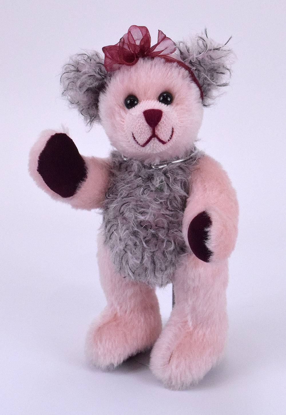 Das Besondere an Rosi: Kopf, Arme und Beine sind aus zartrosa Mohair gefertigt, während Körper und Ohren aus längerem rosa-schwarzem Ratinee-Mohair bestehen. Diese Kombination sorgt für eine edle Struktur und eine interessante optische Tiefe.