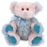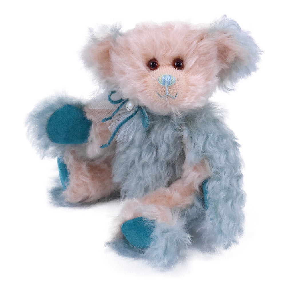 Schelly ist 23 cm groß und durch ihr flauschiges, gelocktes Mohairfell sowie der weichen Füllung wunderbar kuschelig. Der kleine Teddybär, der sehr gut in eine Hand passt, strahlt in den pastelligen Farben des harmonischen Mohairs. Als modisches Accessoire trägt das Kuschelbärchen eine hübsche Schleife.