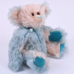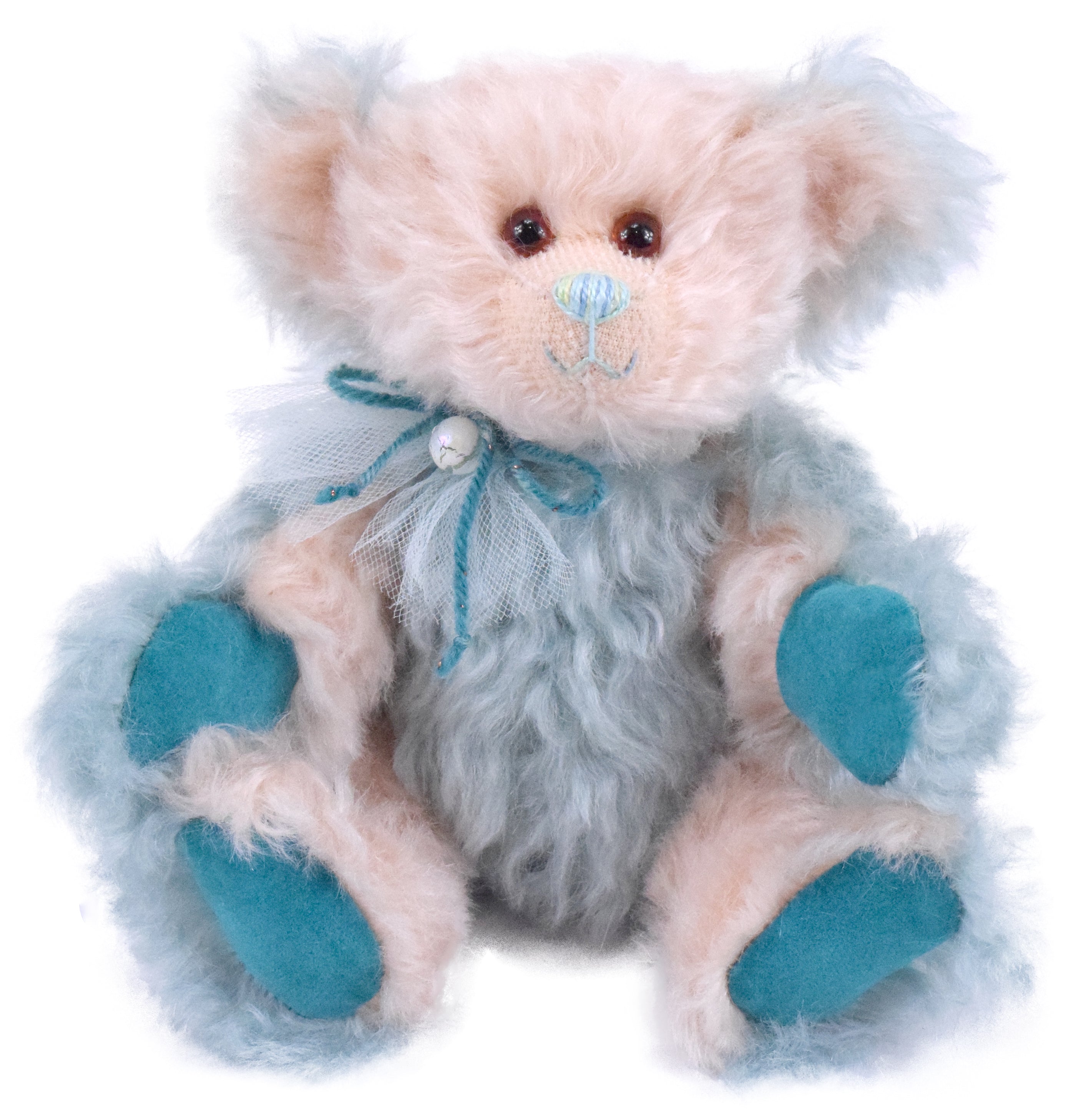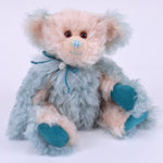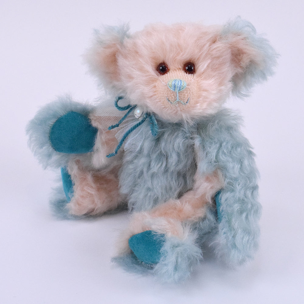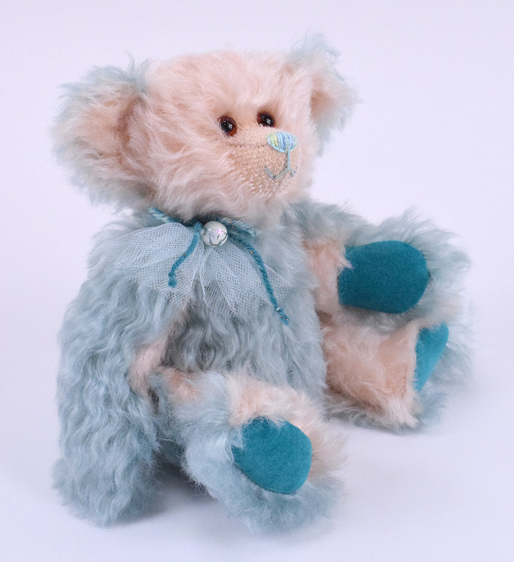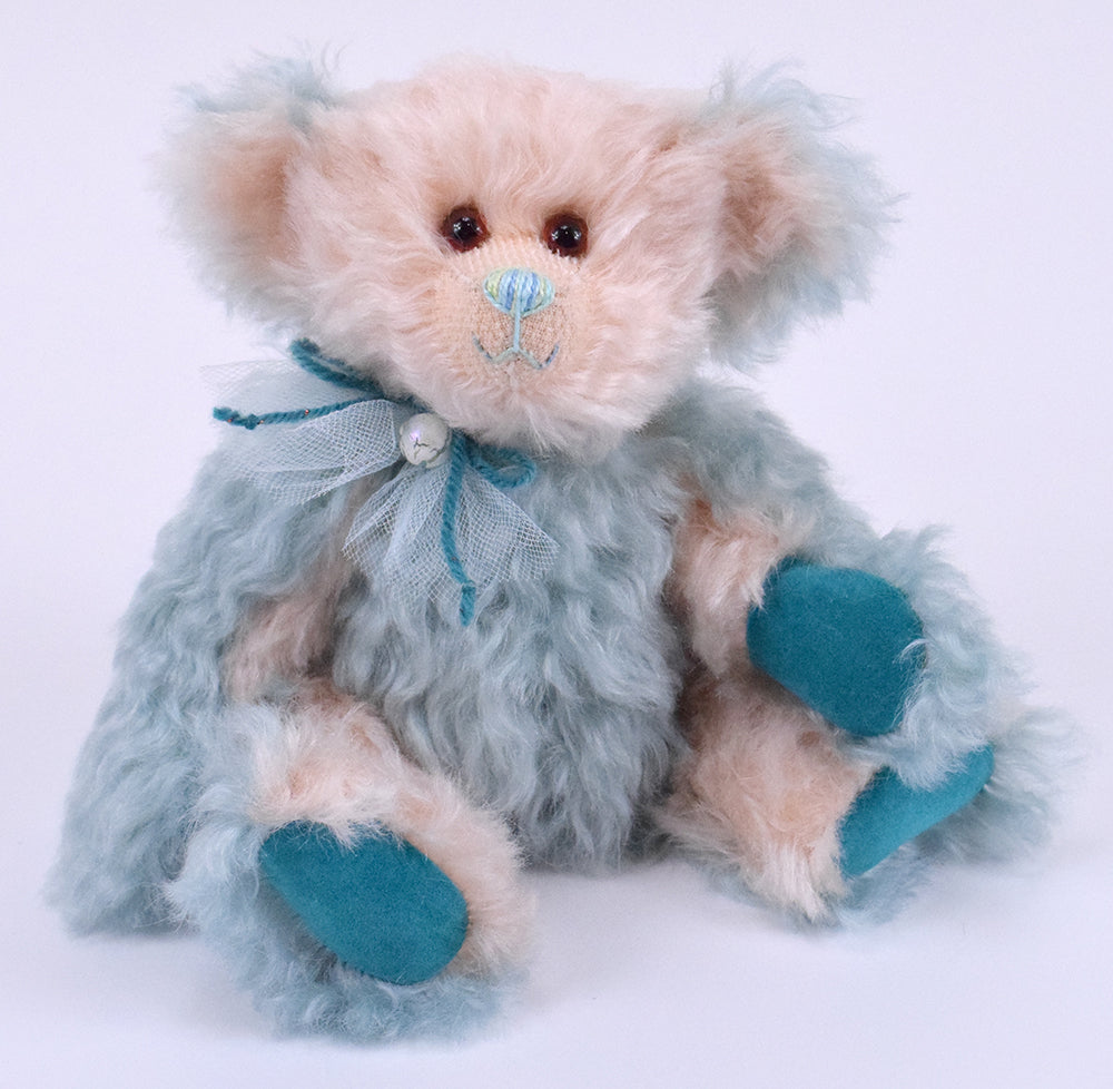 Schelly ist ein bezauberndes Bärchen aus pastellfarben Mohair. Die beiden Farbnuancen werden durch kräftige petrolfarbe Sohlen und Pfoten abgerundet. Das Näschen ist mit mintfarbenen und pastelligblauen Garn zu einem freundlichen Lächeln bestickt.