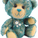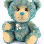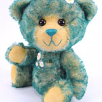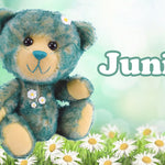Juni ist ein 30 cm großer, freundlicher Teddybär. Das blonde Fell mit den grünen Spitzen erinnert sofort an eine frische grüne Wiese mit kleinen Gänseblümchen. Und Teddybär Juni sitzt gerne in der Wiese und zählt Gänseblümchen. Das liebe Gesicht mit den schwarzen großen Knopfaugen ist rasiert wobei der Farbkontrast des Untergrunds toll zur Geltung kommt. Farblich passen dazu Sohlen und Pfoten genau.