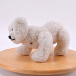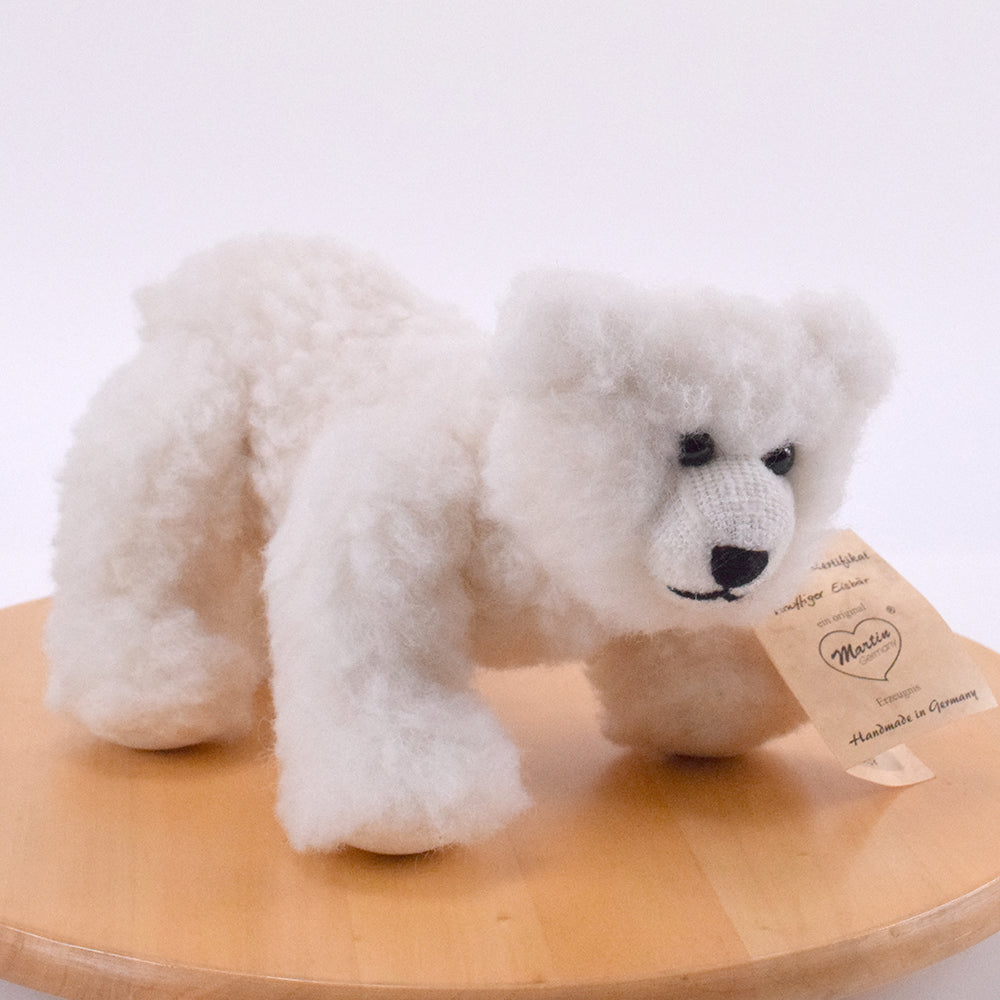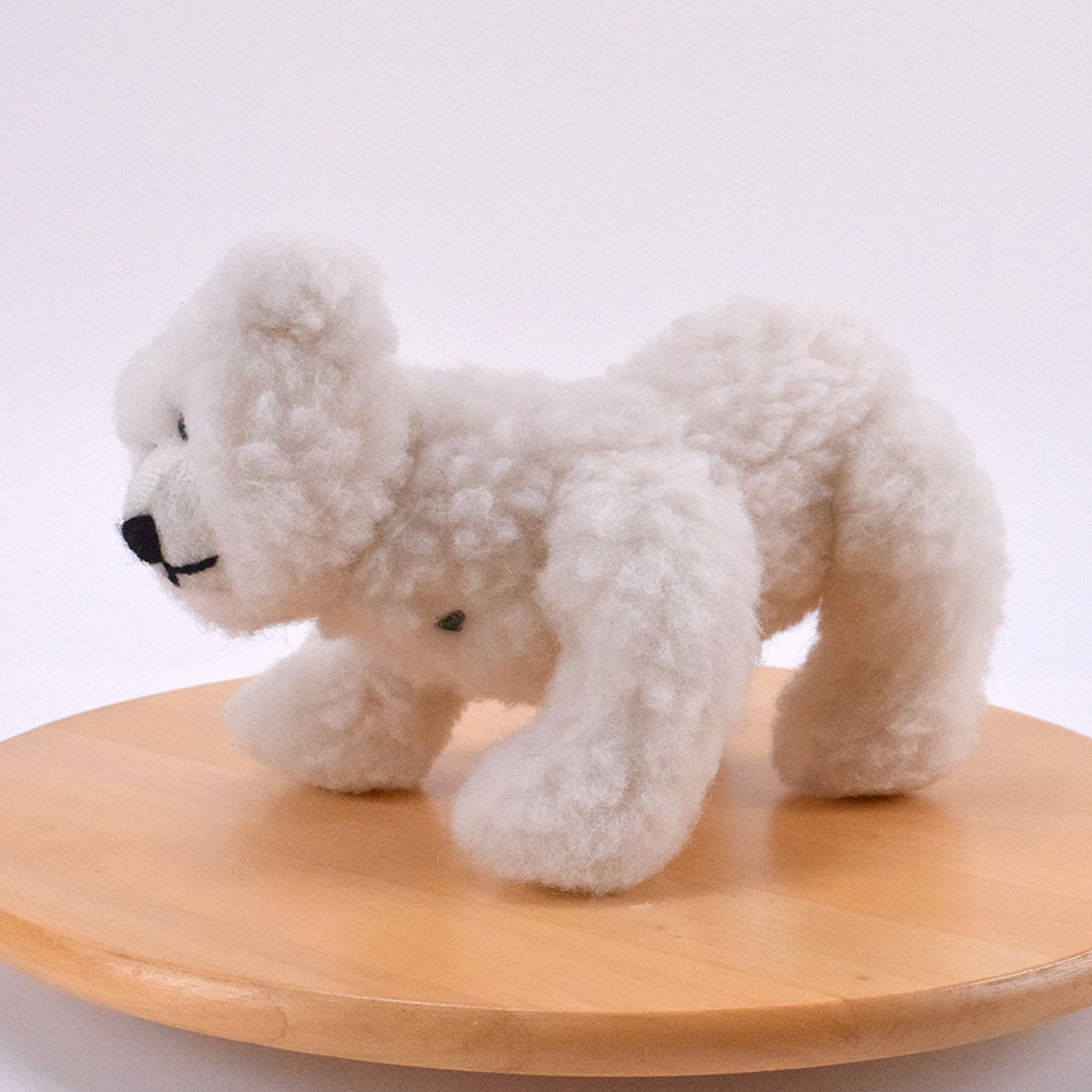 Sein naturweißes Fell aus reiner Merino-Schurwolle fühlt sich weich und hochwertig an. Auch das Füllmaterial besteht aus reiner Merino-Schurwolle, wodurch der Bär eine schöne Form und eine angenehme, natürliche Haptik erhält.