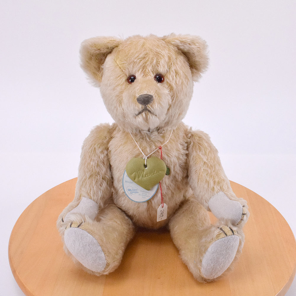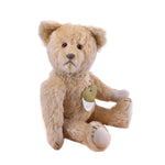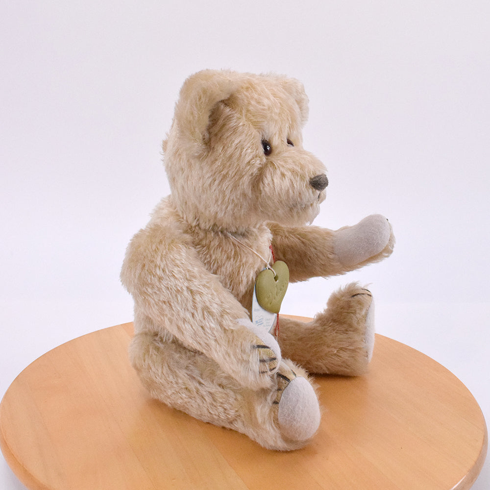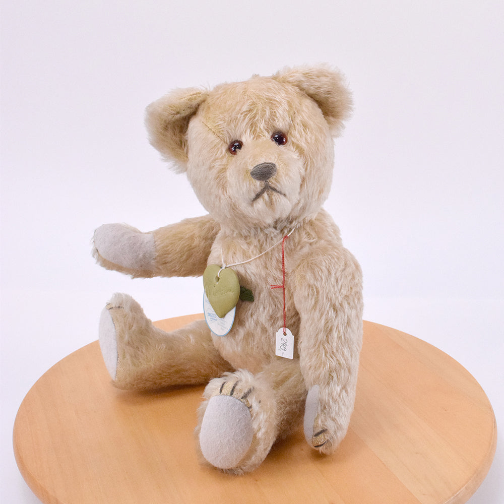 Mit seinen 37 cm ist Moritz eine stattliche Erscheinung. Sein hellbraunes Mohairfell wirkt warm und natürlich und unterstreicht seinen nostalgischen Charakter. Die rot-braunen Glasaugen verleihen ihm einen ausdrucksstarken, sanften Blick voller Tiefe und Persönlichkeit.