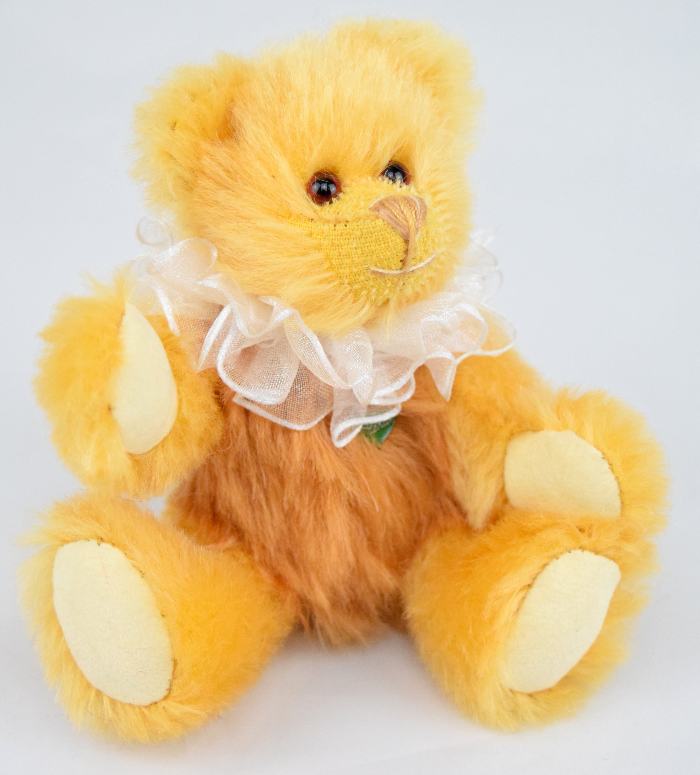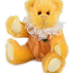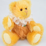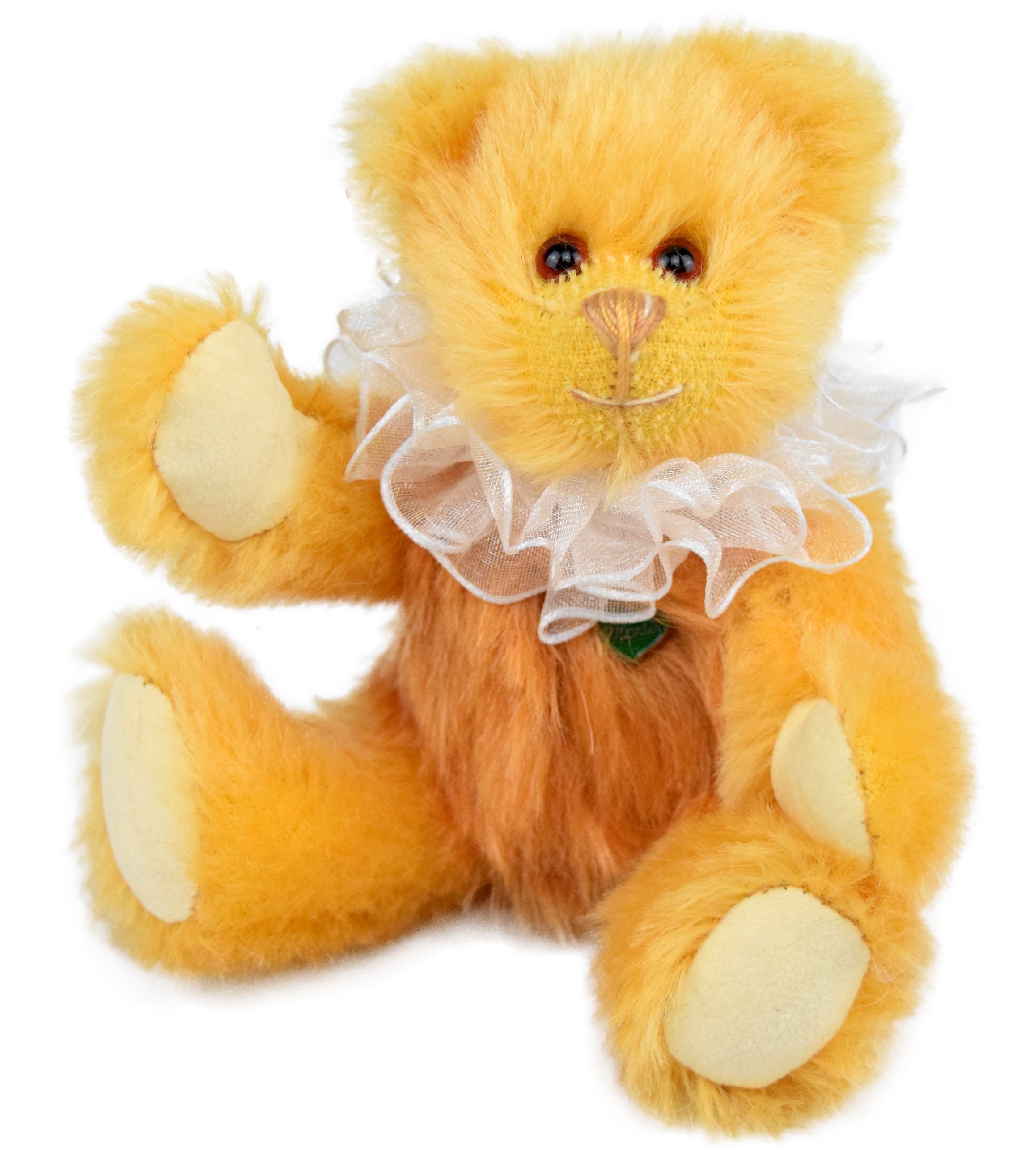 Pfirsich- und Aprikosentörtchen ist 15 cm groß und aus zweierlei apricot- bzw. pfirsichfarbenen Mohair gemacht. Es trägt eine Krause und sieht richtig zum Anbeißen aus.