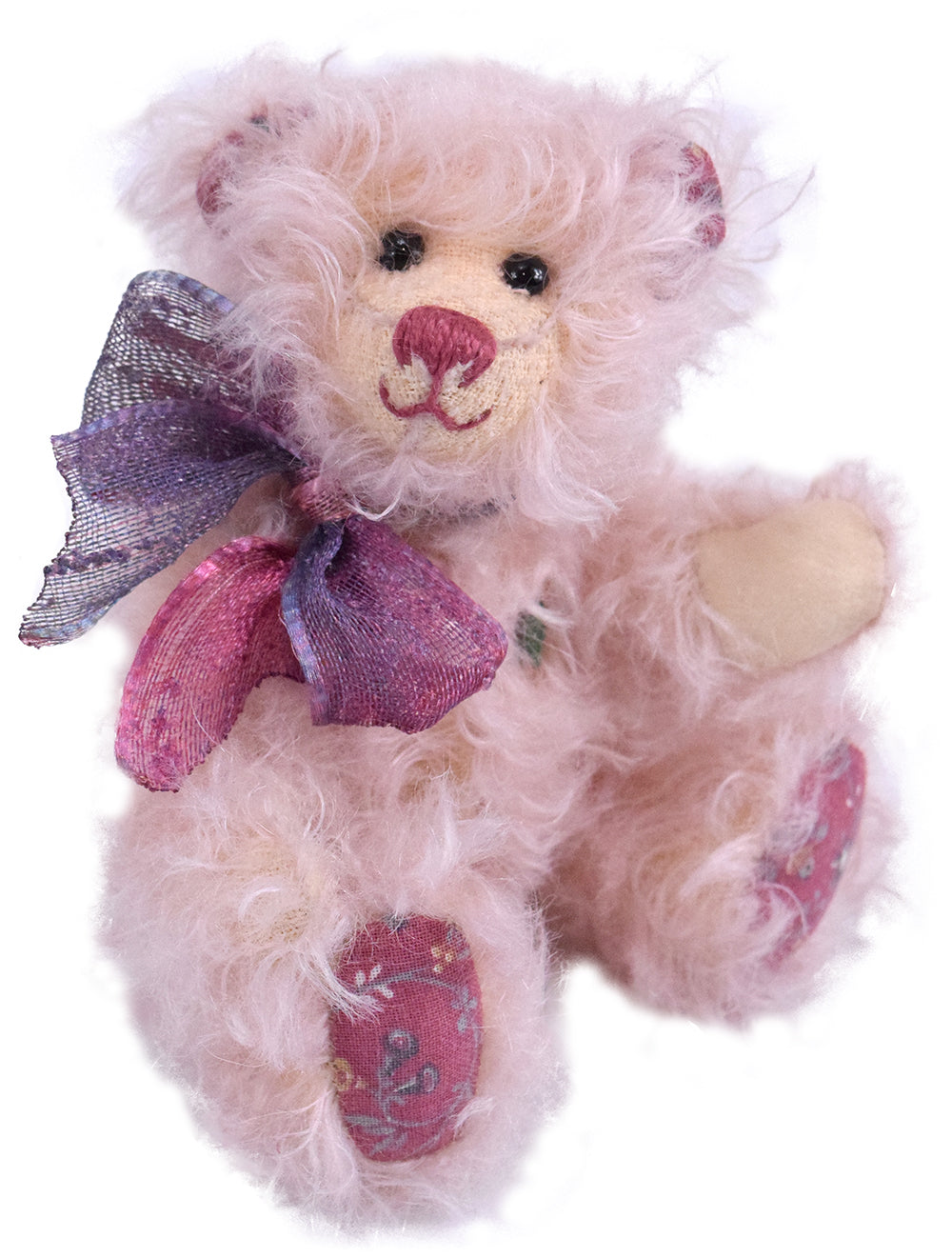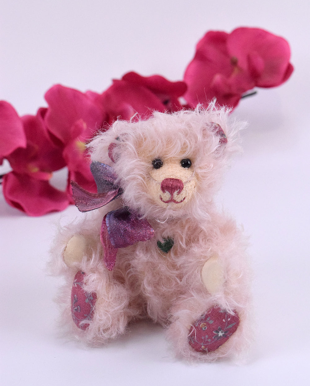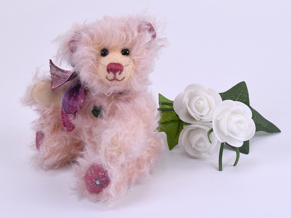 Unser 15 cm großes Muttertagsbärchen ist ein wahres Schmuckstück, das aus edlem rosa Mohair gefertigt wurde und mit einem herzlichen Lächeln jeden verzaubert. Seine besonderen Details machen es einzigartig: Die Pfoten sind aus hochwertigem Waschleder gearbeitet, während die Sohlen und die Innenseiten der Ohren mit schönem Blumenmusterstoff verziert sind. Diese liebevollen Akzente verleihen dem Bärchen seinen unverwechselbaren Charme.