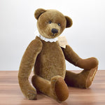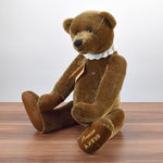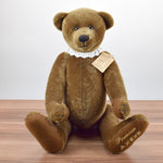 Sein kurzes, braunes Mohair, die schwarzen Augen und der weiße Spitzenkragen verleihen ihm eine zeitlose, edle Ausstrahlung. Sohlen, Pfoten und Nase sind sorgfältig von Hand gestickt – ein wunderschönes Beispiel klassischer Bärenkunst.