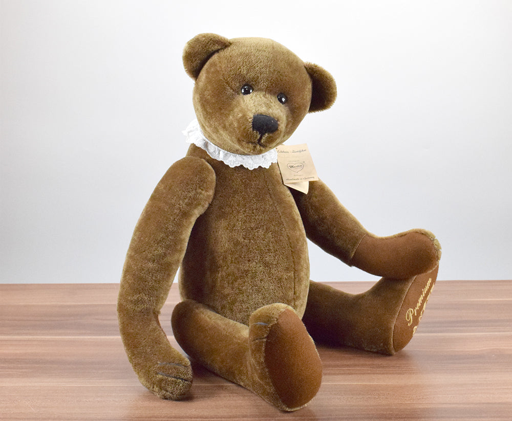 Der Premium Antik ist ein beeindruckender Bär im Stil der frühen Manufakturschätze – 65 cm groß und nach traditioneller Handwerkskunst mit Holzwolle gefüllt. Beim Bewegen lässt er seine Brummstimme erklingen – warm, tief und nostalgisch.