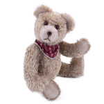 Er trägt ein weinrotes Halstuch mit feinem Muster, das ihm eine Spur von klassischer Eleganz verleiht. Seine braunen Glasaugen und die feine Glasnase, die im Licht sanft glänzt, schenken ihm einen lebendigen, herzlichen Ausdruck – so, als wolle er sagen: „Ich bin für dich da.“