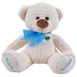 Der weiße Teddybär aus kuschelig weichem Plüsch lädt zum Festhalten ein und schenkt Geborgenheit. Auf seinen Sohlen trägt er die liebevolle Botschaft „Tröste“ und „Bärchen“ in blauer Bestickung. Die blaue Schleife unterstreicht seinen ruhigen, sanften Charakter.