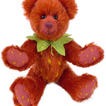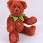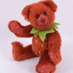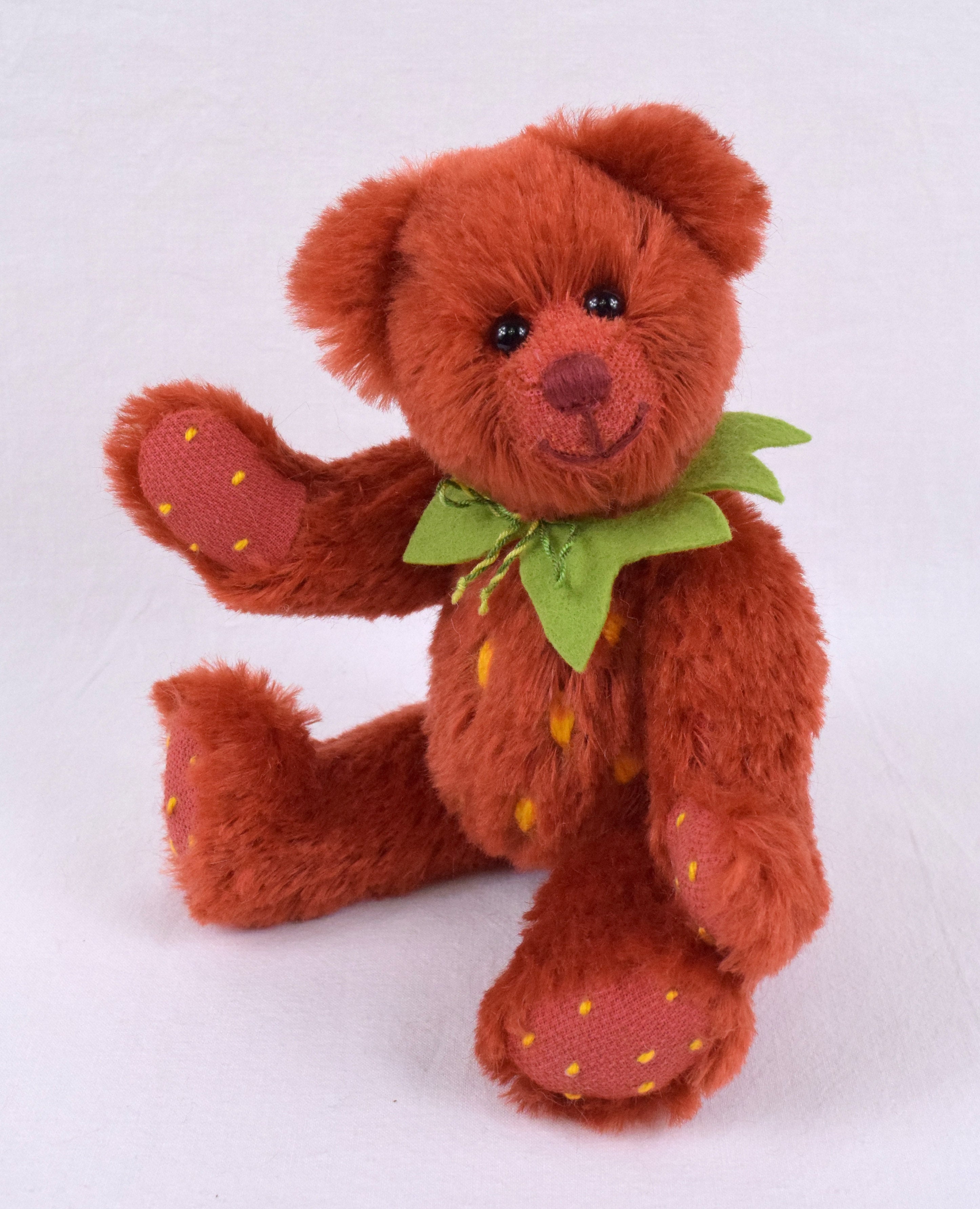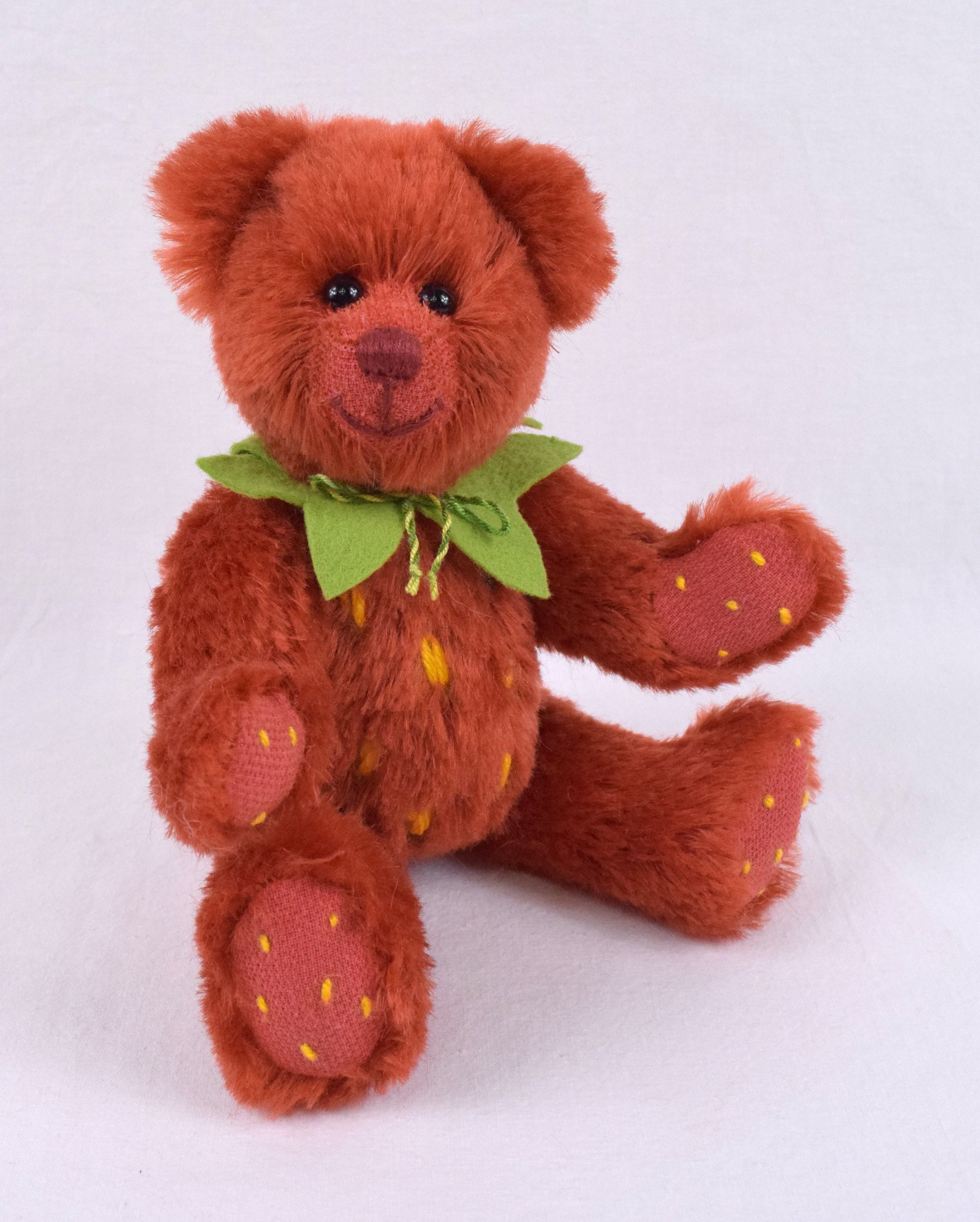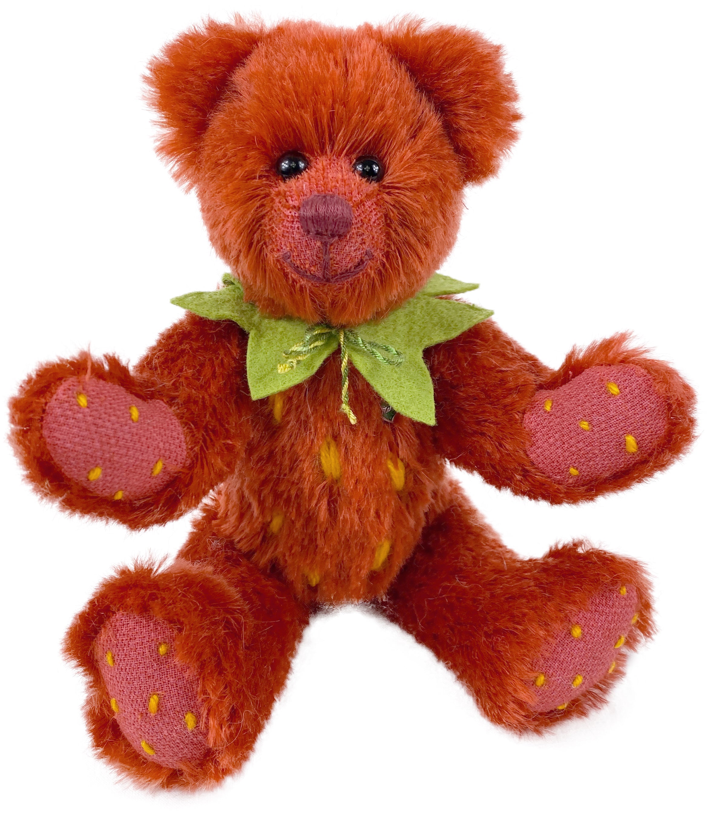 Mit Fell aus rotem Mohair und den typischen gelben Tupfen sieht sie einer echten Erdbeere zum Verwechseln ähnlich. Pfoten und Sohlen sind rasiert und ebenfalls mit gelben Tupfen bestickt. Den Hals schmückt ein grüner Blätterkranz aus Filz.