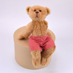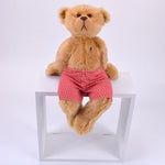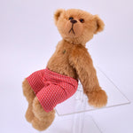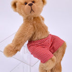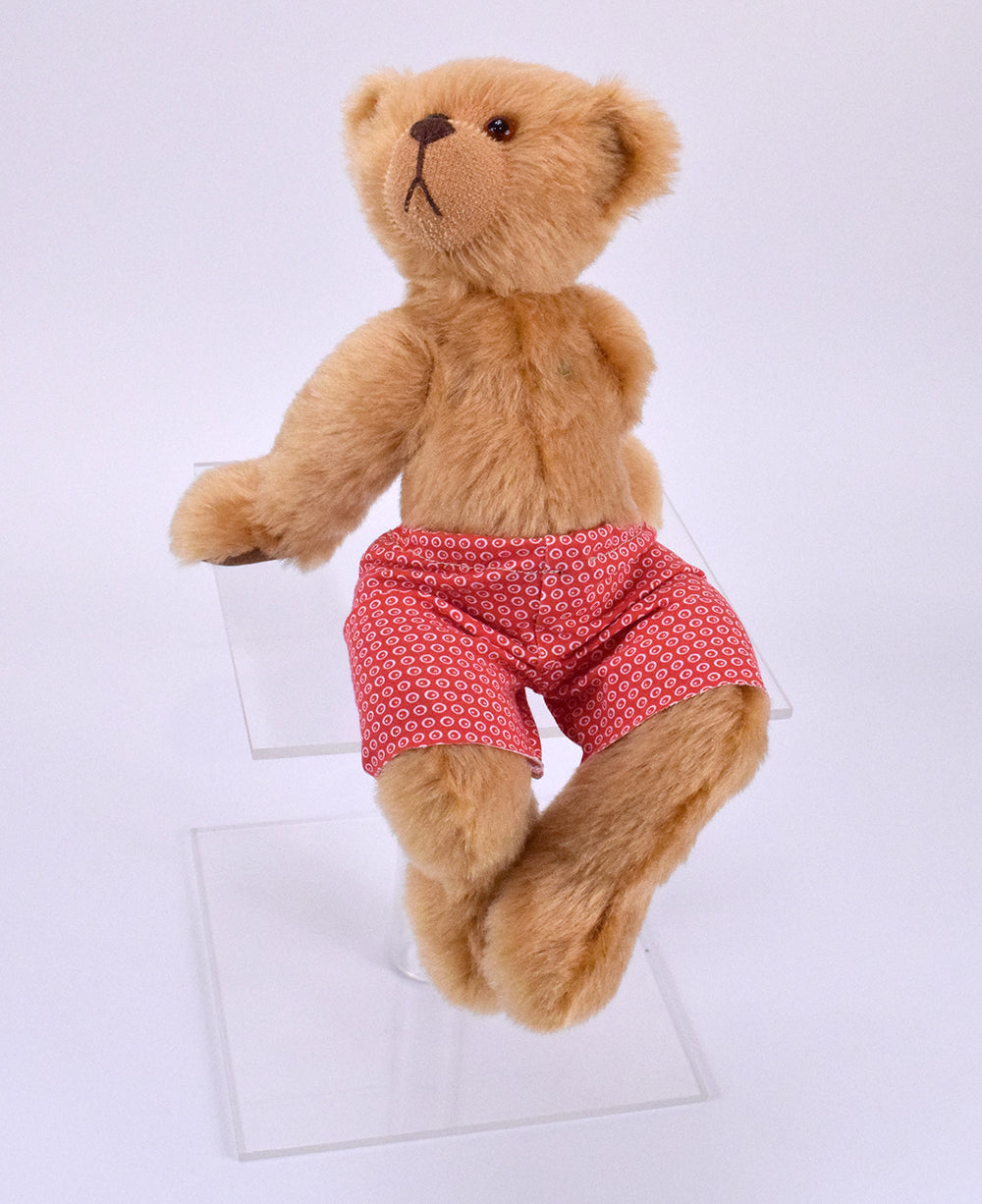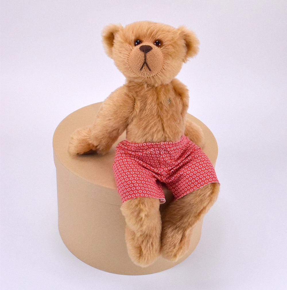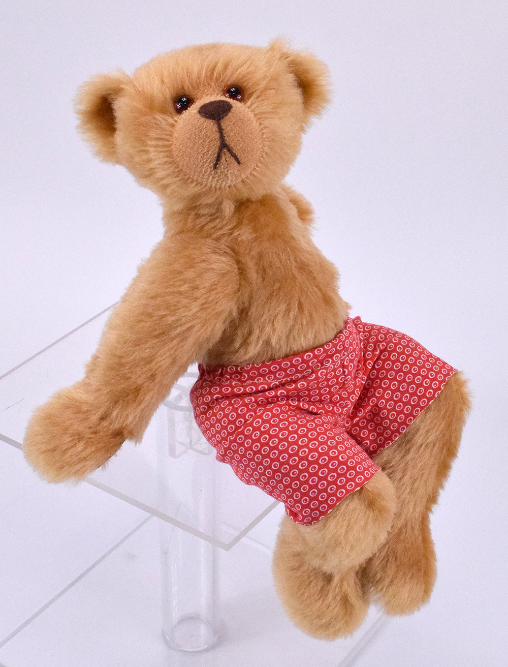 Bobby ist ein gemütlicher Bär mit einer ganz besonderen Ausstrahlung. Mit seinen 35 cm Größe und dem weichen haselnussbraunen Mohair lädt er sofort zum Schmunzeln ein. Seine gebeugten Beine und die nach hinten abgestützten Arme machen ihn zu einem echten Sitzbären – perfekt, um auf einer Regal- oder Tischkante Platz zu nehmen und entspannt in die Welt zu schauen.