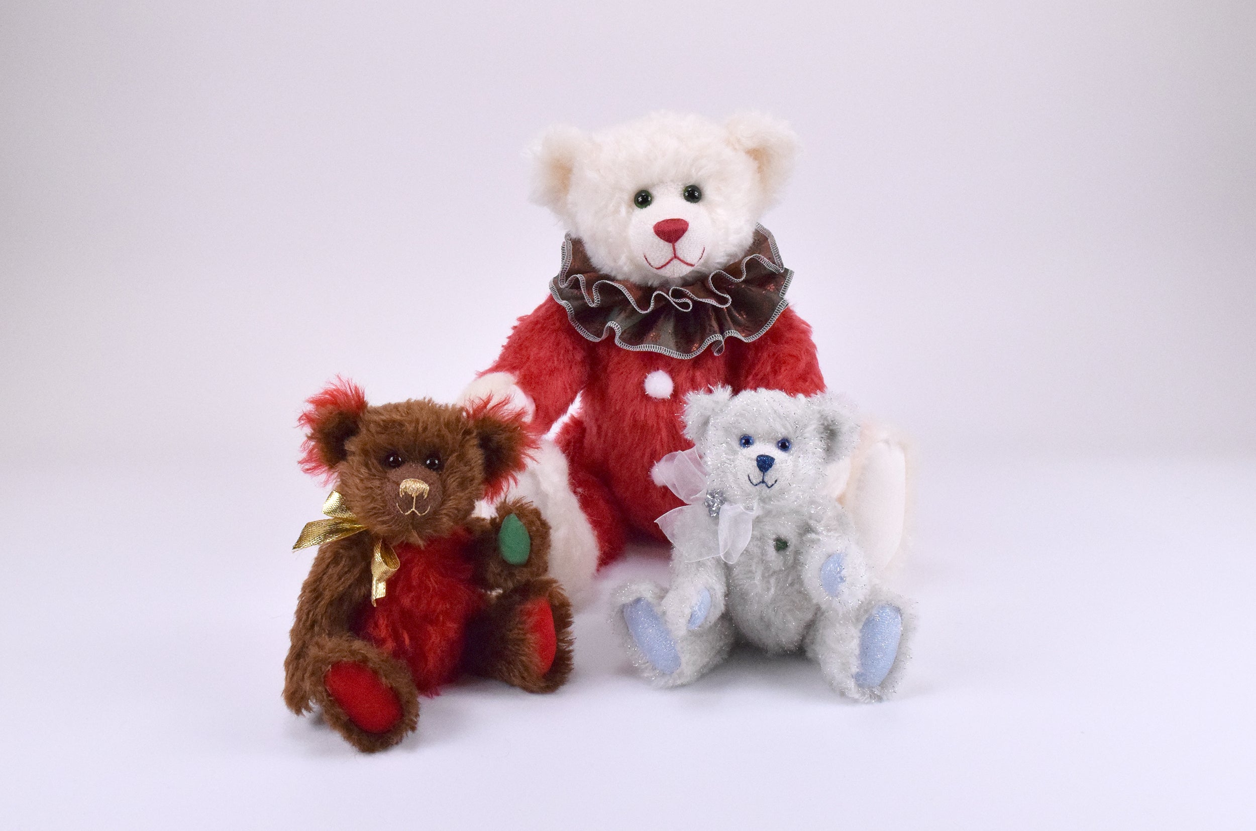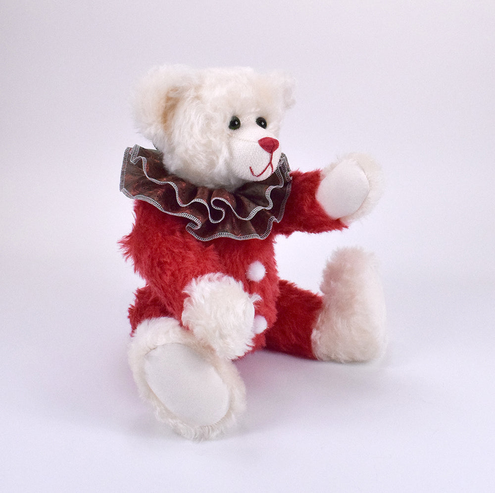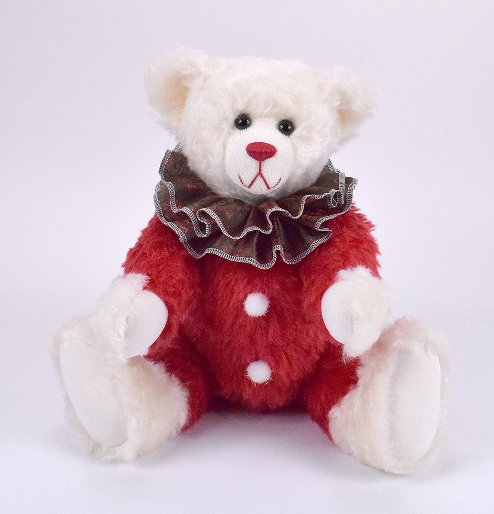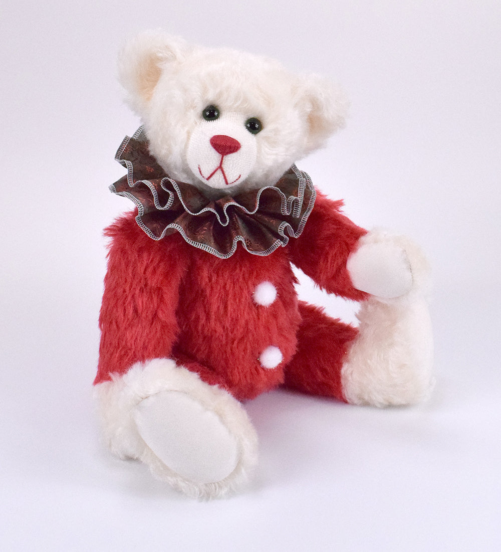 Hier kommt Claus, ein 44 cm großer Teddybär voller Weihnachtsstimmung und klassischem Charme. Sein Fell aus edlem Mohair in Rot und Weiß macht ihn zu einem echten Hingucker – festlich, fröhlich und einfach wunderschön.