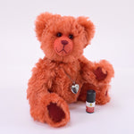 Dieser 33 cm große Teddybär wurde aus terrakotta-rotem Mohair gefertigt und strahlt mit seinem freundlichen Gesicht eine besondere Geborgenheit aus. Sein leicht rasiertes Schnäuzchen, die roten Glasaugen sowie die fein von Hand bestickte Nase und der Mund verleihen ihm einen liebevollen und ausdrucksstarken Charakter. Die Pfoten sind aus rotem Waschleder gearbeitet und setzen einen harmonischen Akzent zum warmen Farbton seines Fells. Gefüllt ist der Bär mit weichem Vlies, wodurch er angenehm präsent wirkt und zugleich sanft in der Hand liegt.