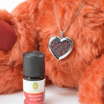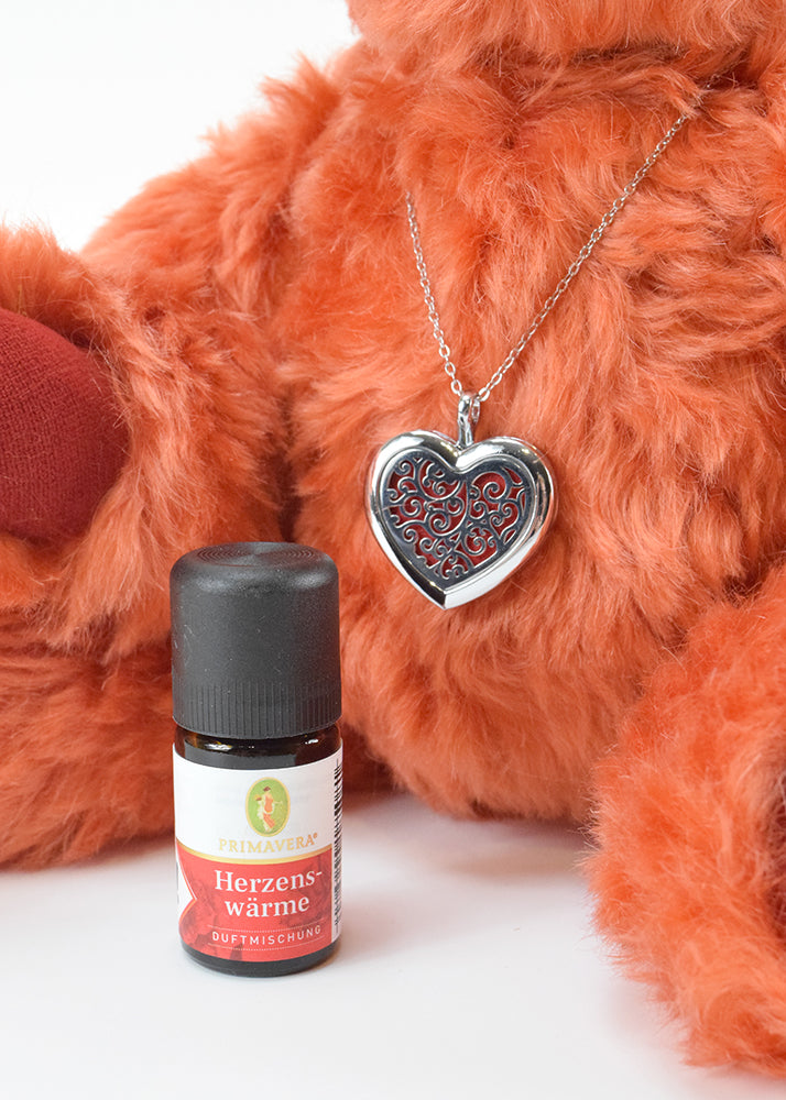 Um den Hals trägt er eine zarte Kette mit einem Herzanhänger. In dieses Herz kann das mitgelieferte Duftöl „Herzenswärme“ geträufelt werden – und schon entfaltet sich seine wohltuende, harmonisierende Wirkung.