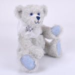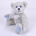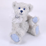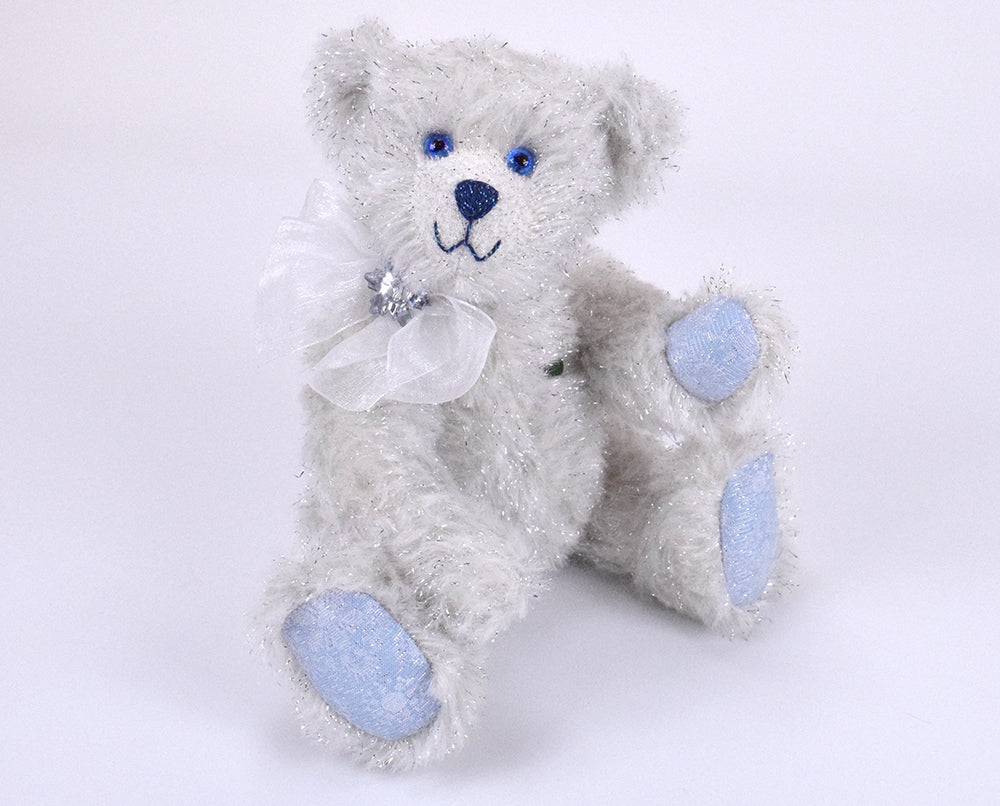 Frosti, ein 23 cm großer Teddybär, der den Winter in seiner schönsten Form einfängt. Sein edles, weißes Mohair ist mit silberfarbenen Fäden durchzogen – so, als würden feine Schneekristalle in seinem Fell glitzern.