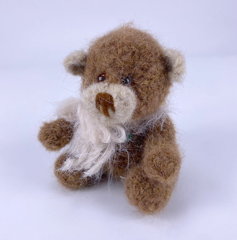 Fädchen ist ein 12 cm großes, sitzendes Häkelbärchen, das mit seinem liebevollen Charme sofort verzaubert. Gehäkelt aus brauner und beiger Alpakawolle, wirkt es warm, natürlich und wunderbar weich.
