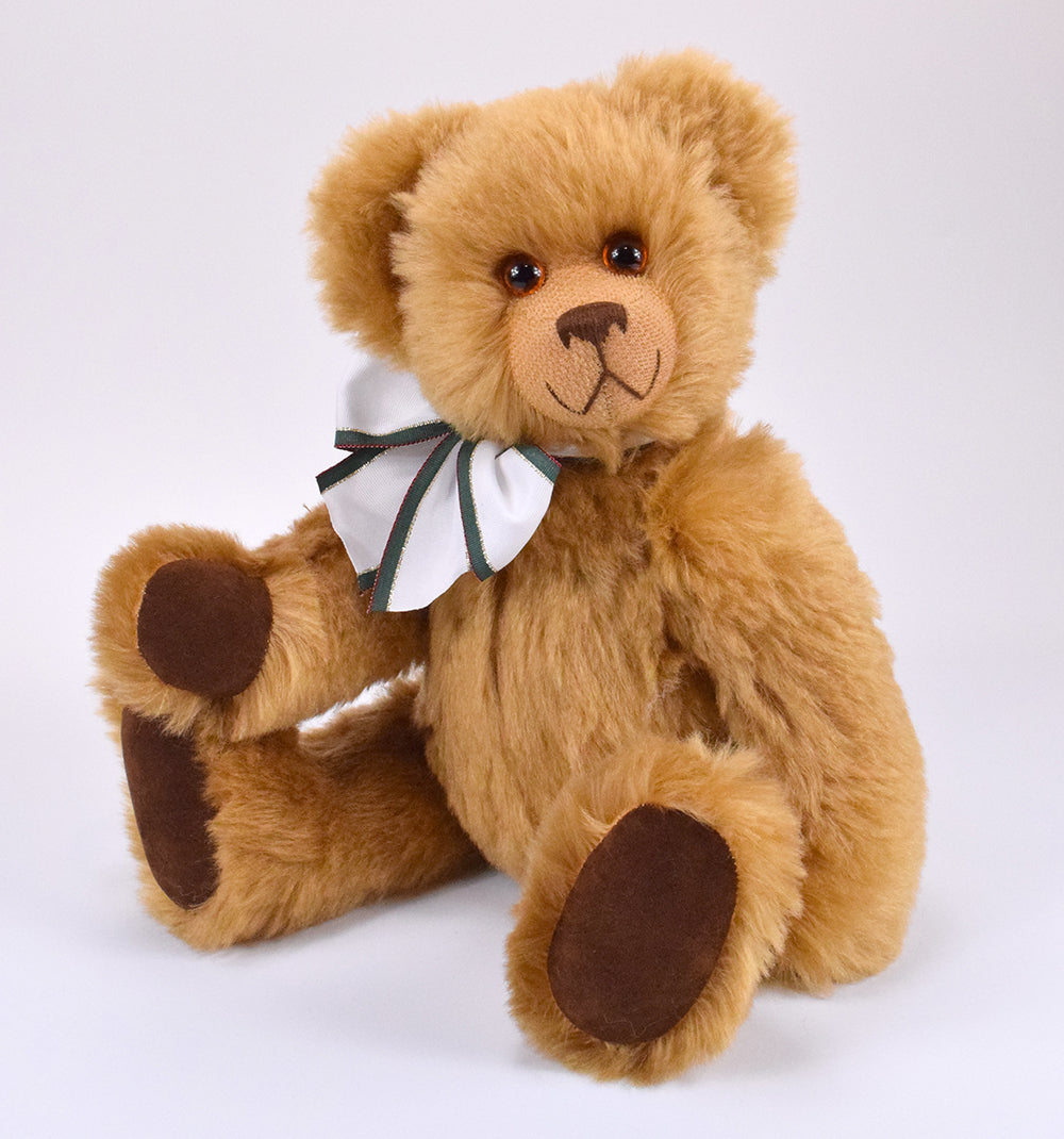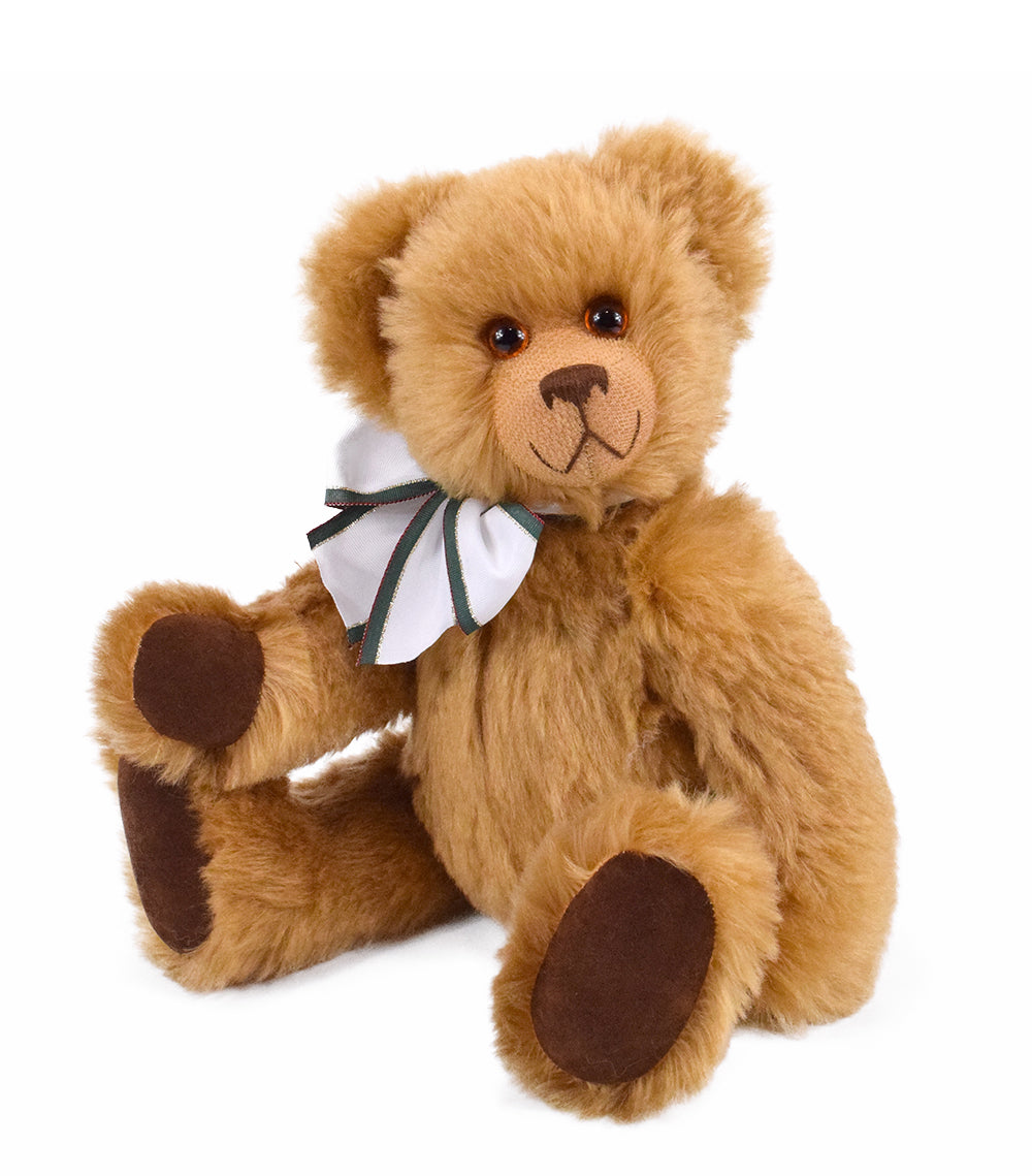 Ludwig trägt eine weiße Schleife mit grünem Rand, schlicht und edel, und verleiht ihm etwas Feierliches. Er misst 41 cm und ist damit ein klassischer Teddybär, wie man ihn sich wünscht: zum Liebhaben, Sammeln und Behalten.