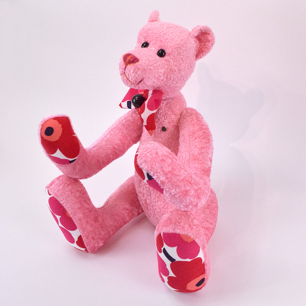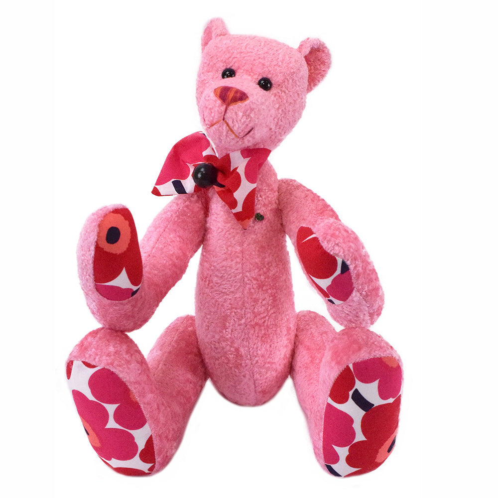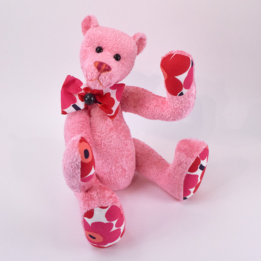 Die schwarzen Glasaugen verleihen einen wachen, freundlichen Blick. An Pfoten und Sohlen sorgt ein fröhlicher blumiger Stoff für farbenfrohe Akzente – ein Detail, das sofort ins Auge fällt. Aus demselben Stoff entsteht auch die passende Schleife, geschmückt mit einer kleinen dunklen Perle.