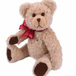 Seine liebevollen Details machen ihn einzigartig: warme braune Augen, ein freundlich gesticktes Lächeln sowie ein rasierte Schnäuzchen mit dunkelbrauner Handstickerei. Perfekt darauf abgestimmt sind die dunkelbraunen Sohlen und Pfoten. Eine festliche rote Schleife schmückt seinen Hals und verleiht ihm den würdigen Auftritt, den ein Editionsbär verdient.