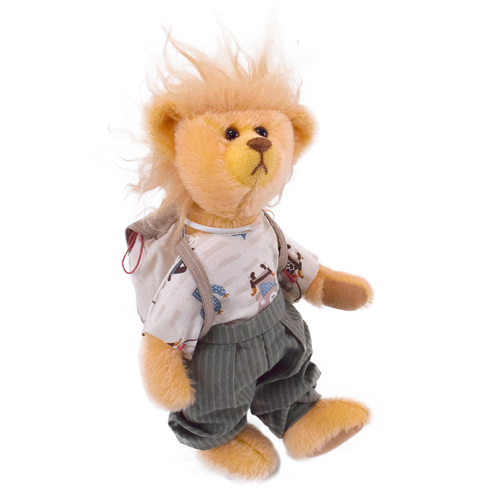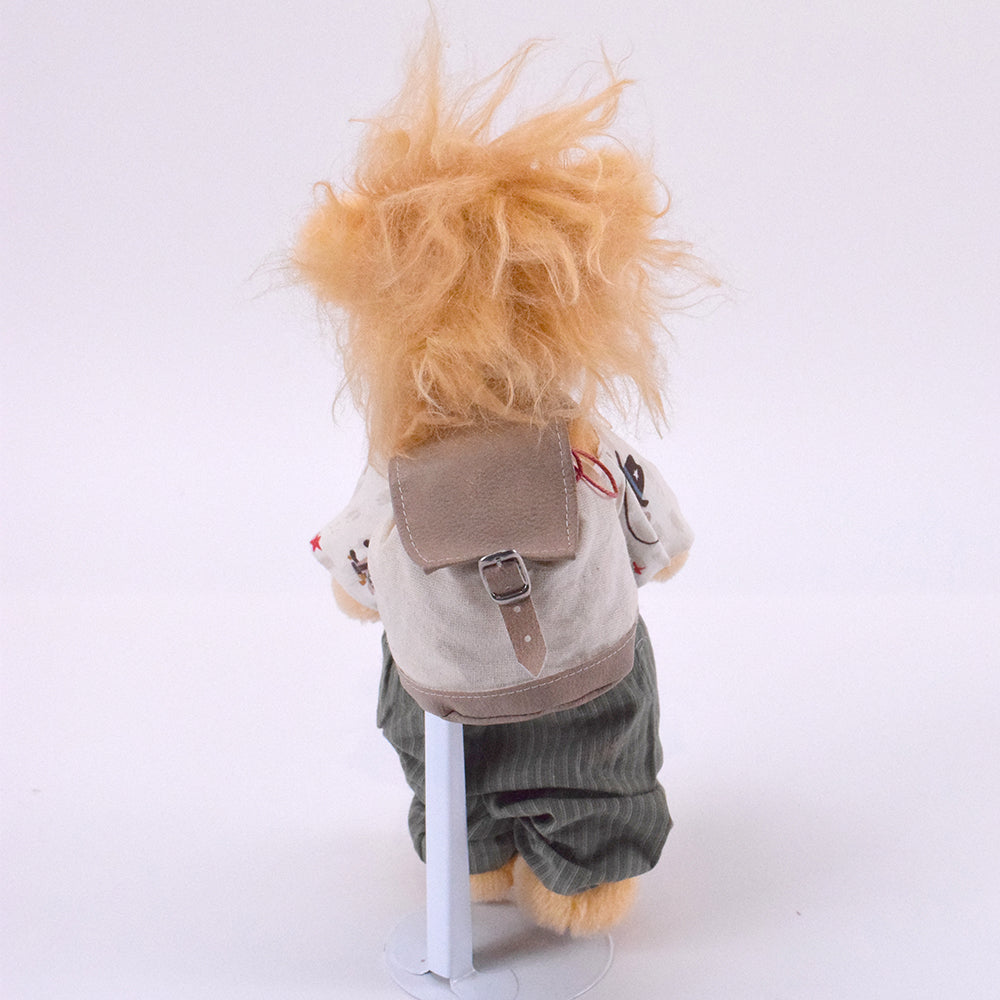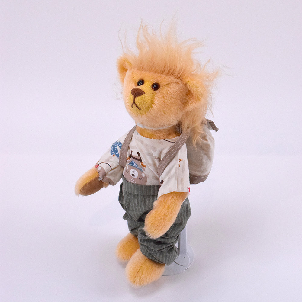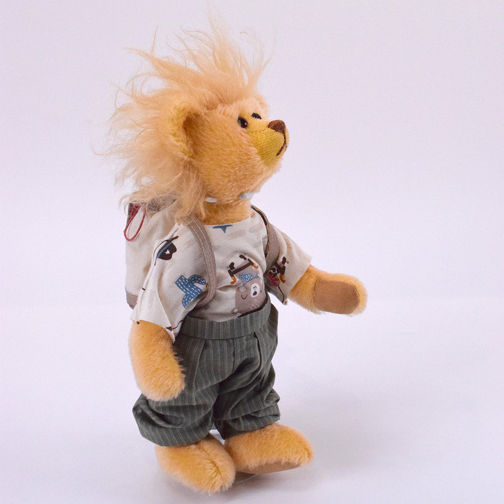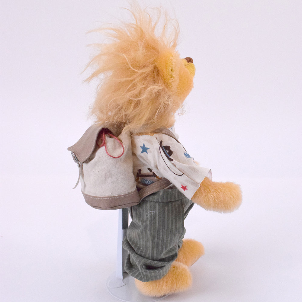 Sein leichtes Shirt, die passende Hose und der kleine Rucksack mit Schnalle und Lederelementen machen ihn zu einem kleinen Weltenbummler. Fast meint man, er würde gleich zu einem Ausflug aufbrechen – vielleicht in eine Blumenwiese oder auf eine lange Reise ins Sammlerherz.