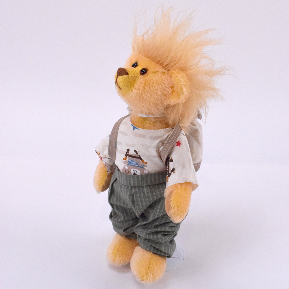 Gefertigt aus hellgelbem Mohair erinnert sein Fell an warme Sonnenstrahlen. Seine rotbraunen Augen schenken ihm einen lebendigen, wachen Ausdruck, der sofort berührt. Die bestickte Nase und der fein gearbeitete Mund verleihen ihm eine sanfte, ehrliche Mimik – ruhig, aber voller Geschichten.