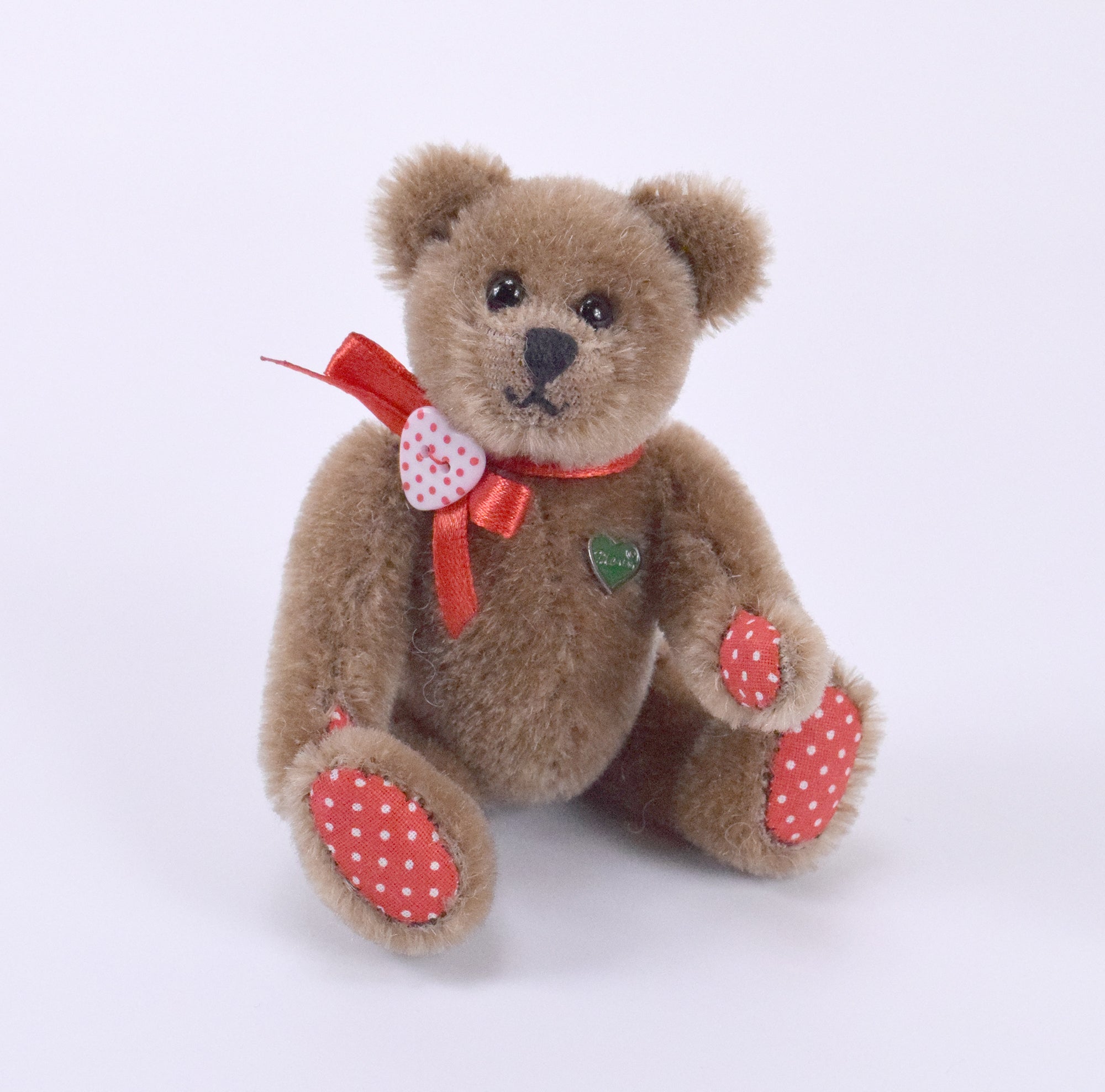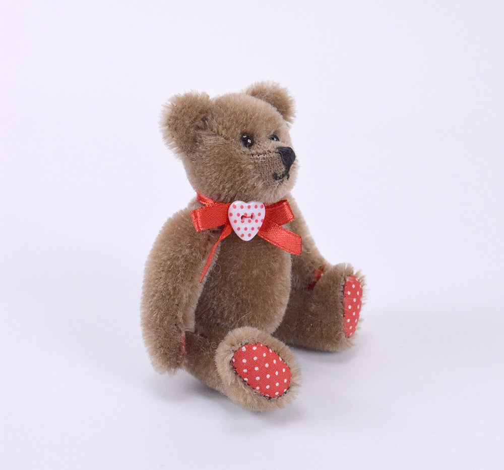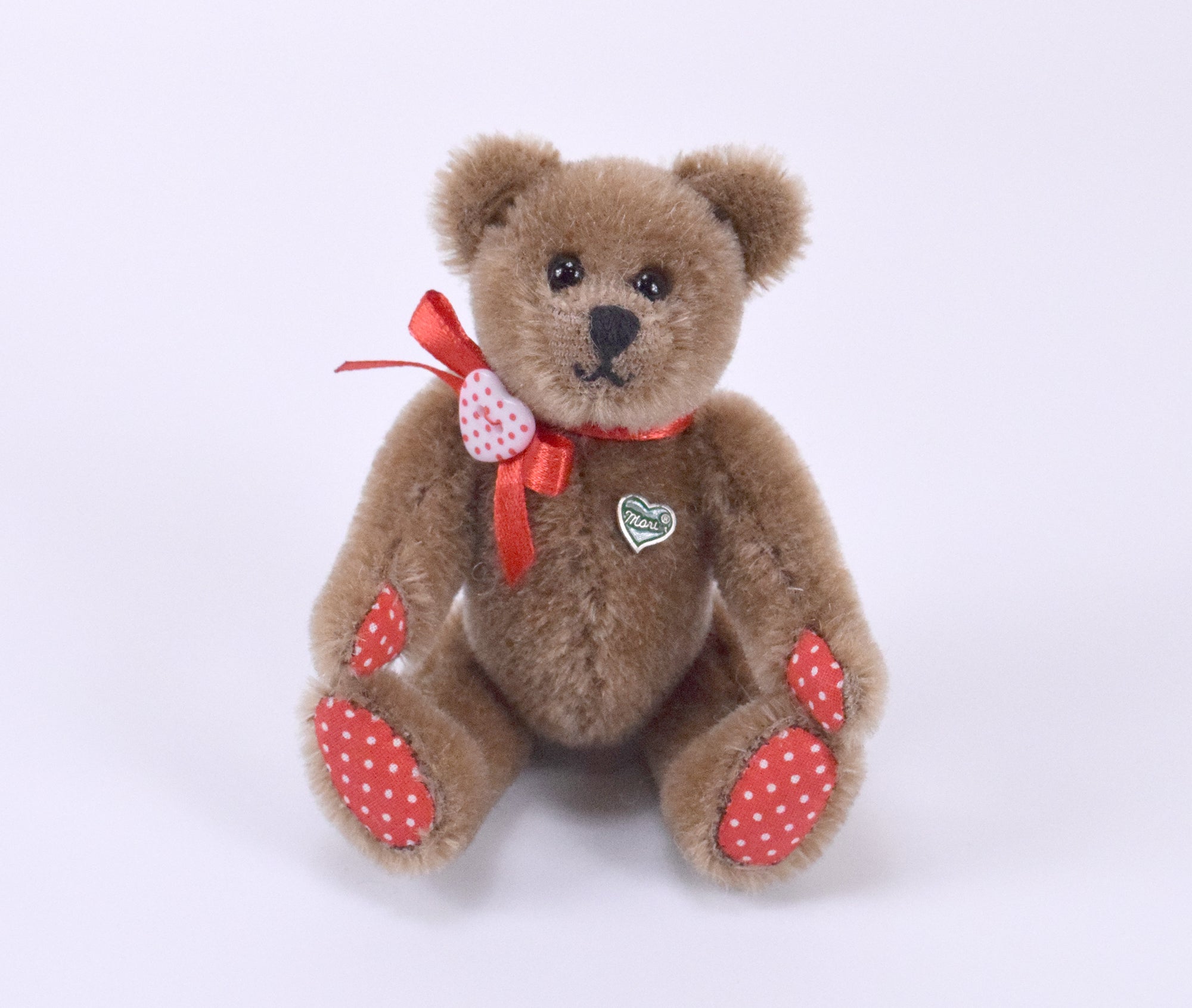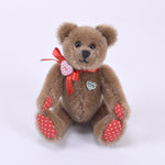 Das Valentinstagsbärchen ist ein 13 cm großes Teddybärchen, das Liebe und Zuneigung auf besonders charmante Weise ausdrückt. Sein warmes, braunes Fell wird ergänzt durch Sohlen und Pfoten aus rotem, verstärktem Stoff mit weißen Punkten – verspielt, fröhlich und voller Herz.