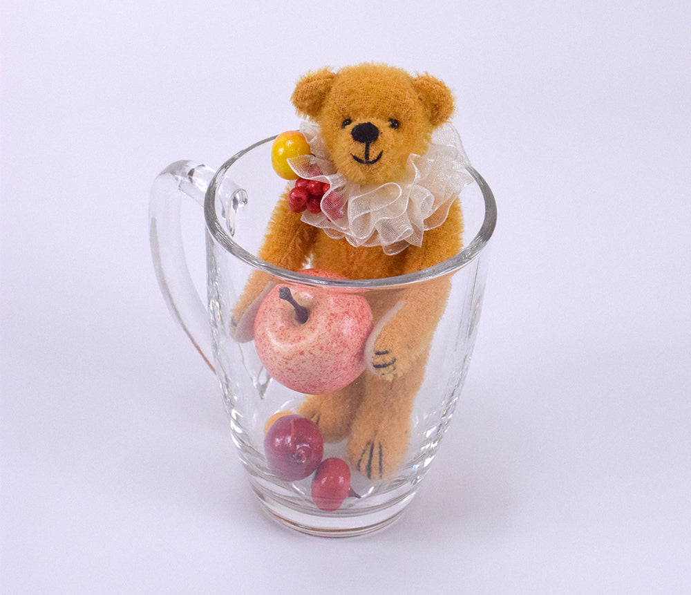 Der Winterpunsch ist ein zauberhaftes 14 cm großes Bärchen, das es sich in einem dekorativen Punschglas gemütlich gemacht hat. In seinen Pfoten hält es einen kleinen Apfel, und an seinem Halsschmuck sind liebevoll Beeren angebracht – kleine Details, die sofort an kalte Tage und warme Getränke erinnern.