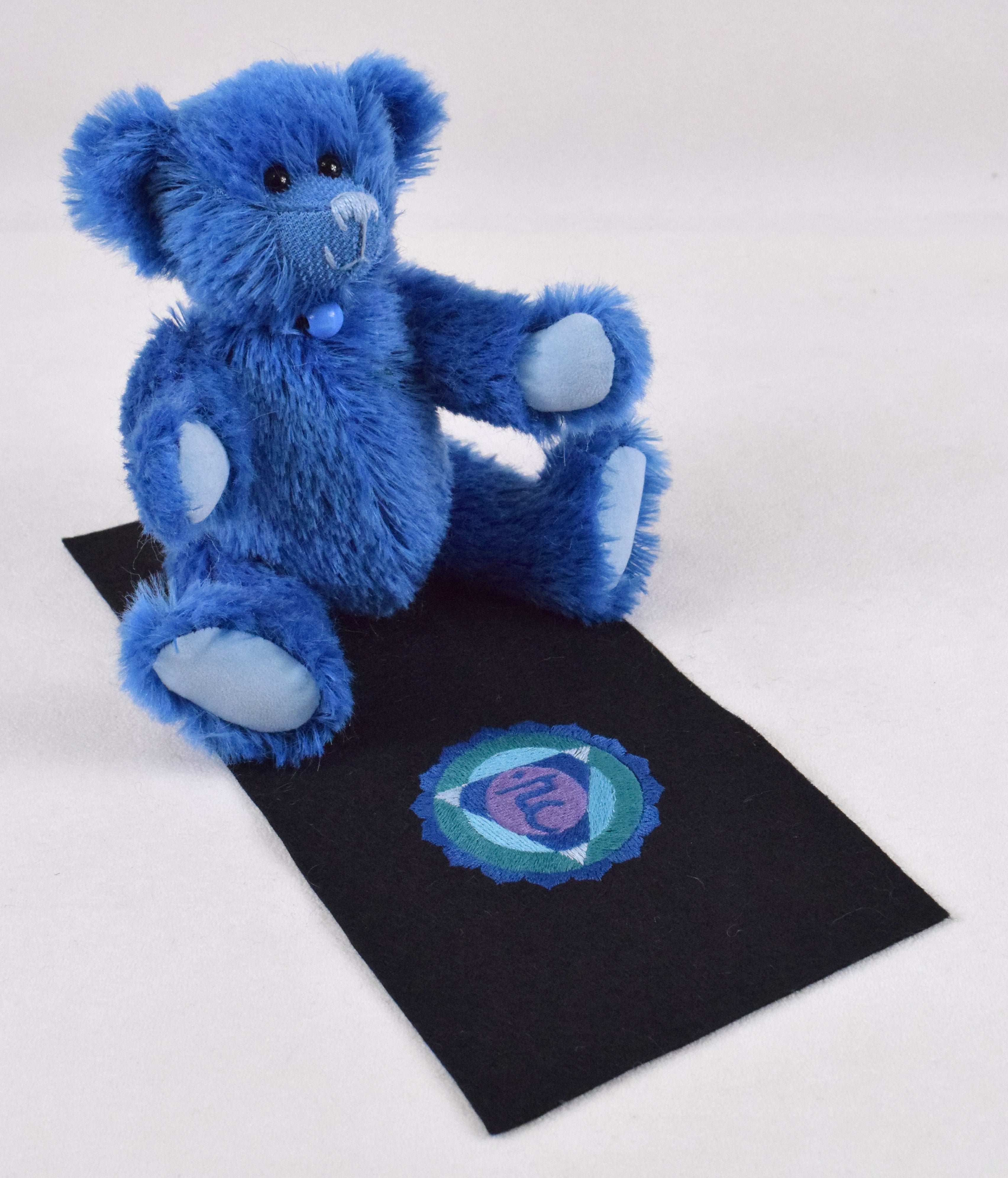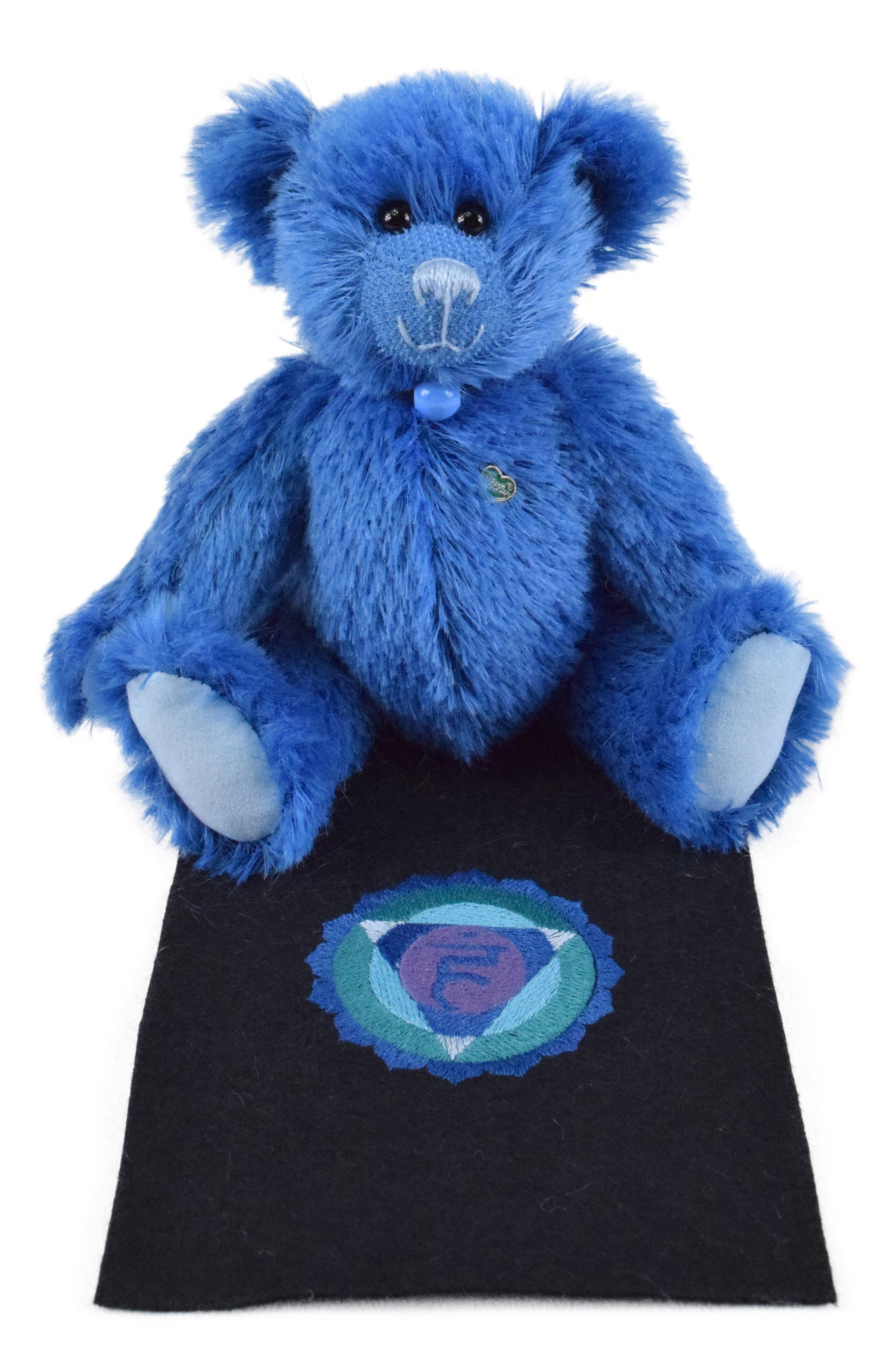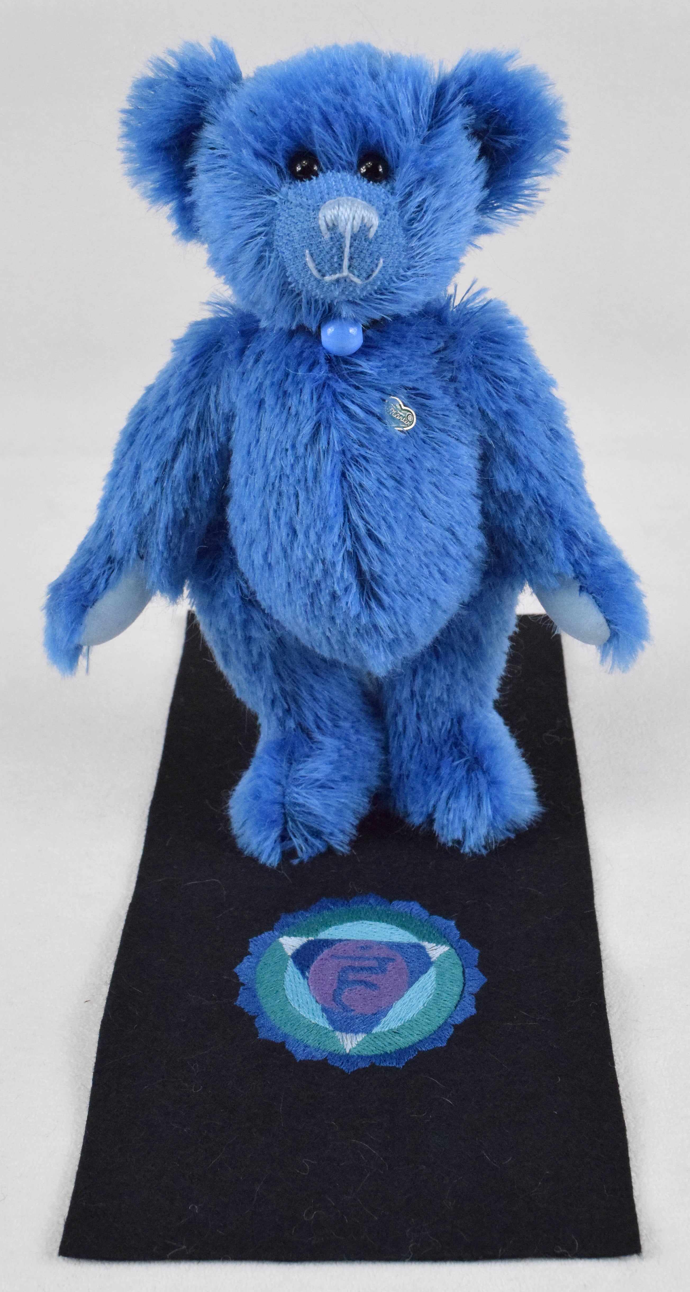 Das blaue Halschakra-Bärchen ist 21 cm groß. Es ist aus wunderschönem blauem Mohair gefertigt und trägt eine blaue Perle an der Stelle des Energiezentrums (direkt am Hals). Es sitzt auf einer edelen schwarzen Filzmatte, die mit dem Halschakra-Symbol bestickt wurde. Das Chakrabärchen ist weltweit auf 99 Stück limitiert.