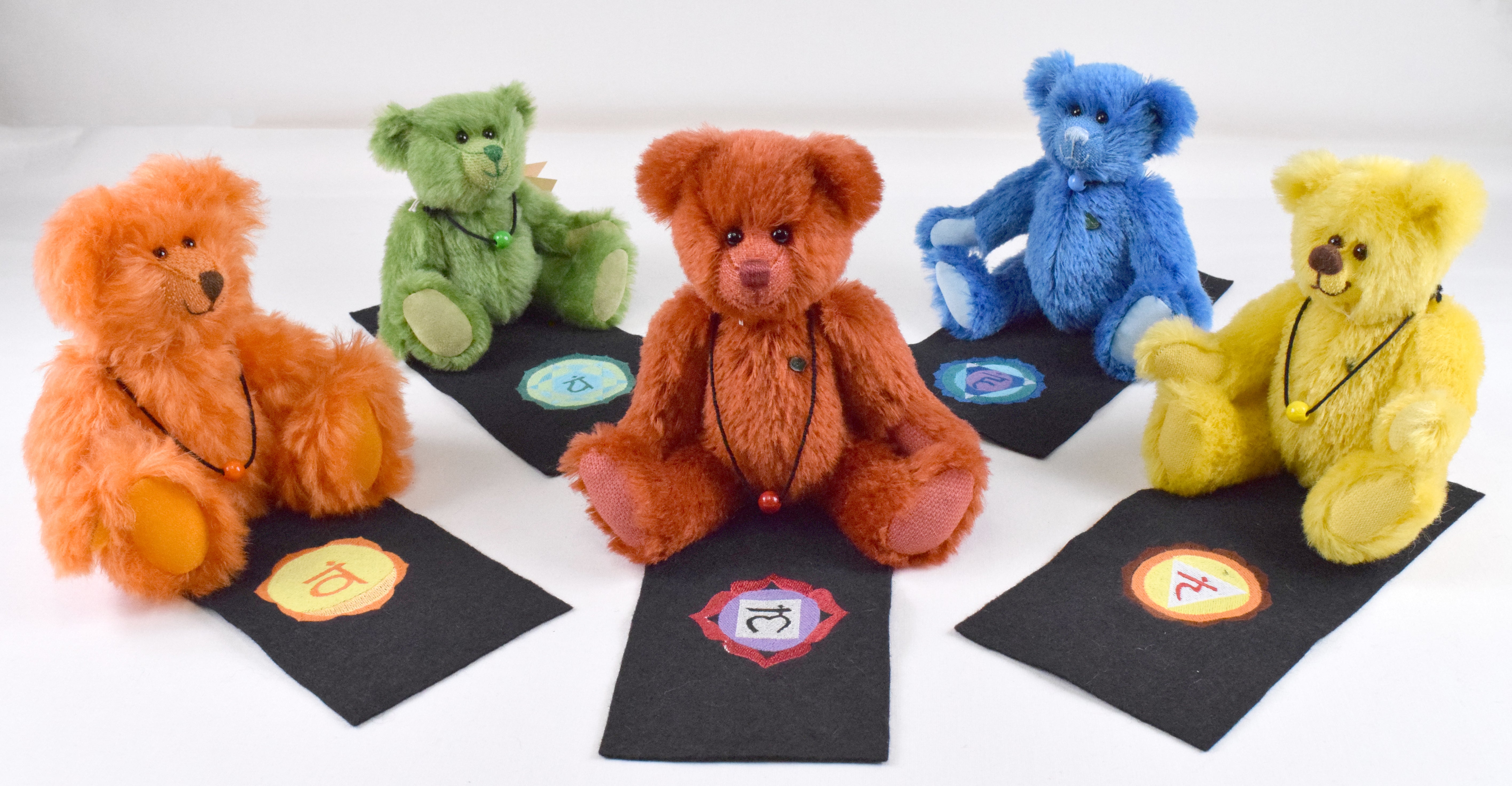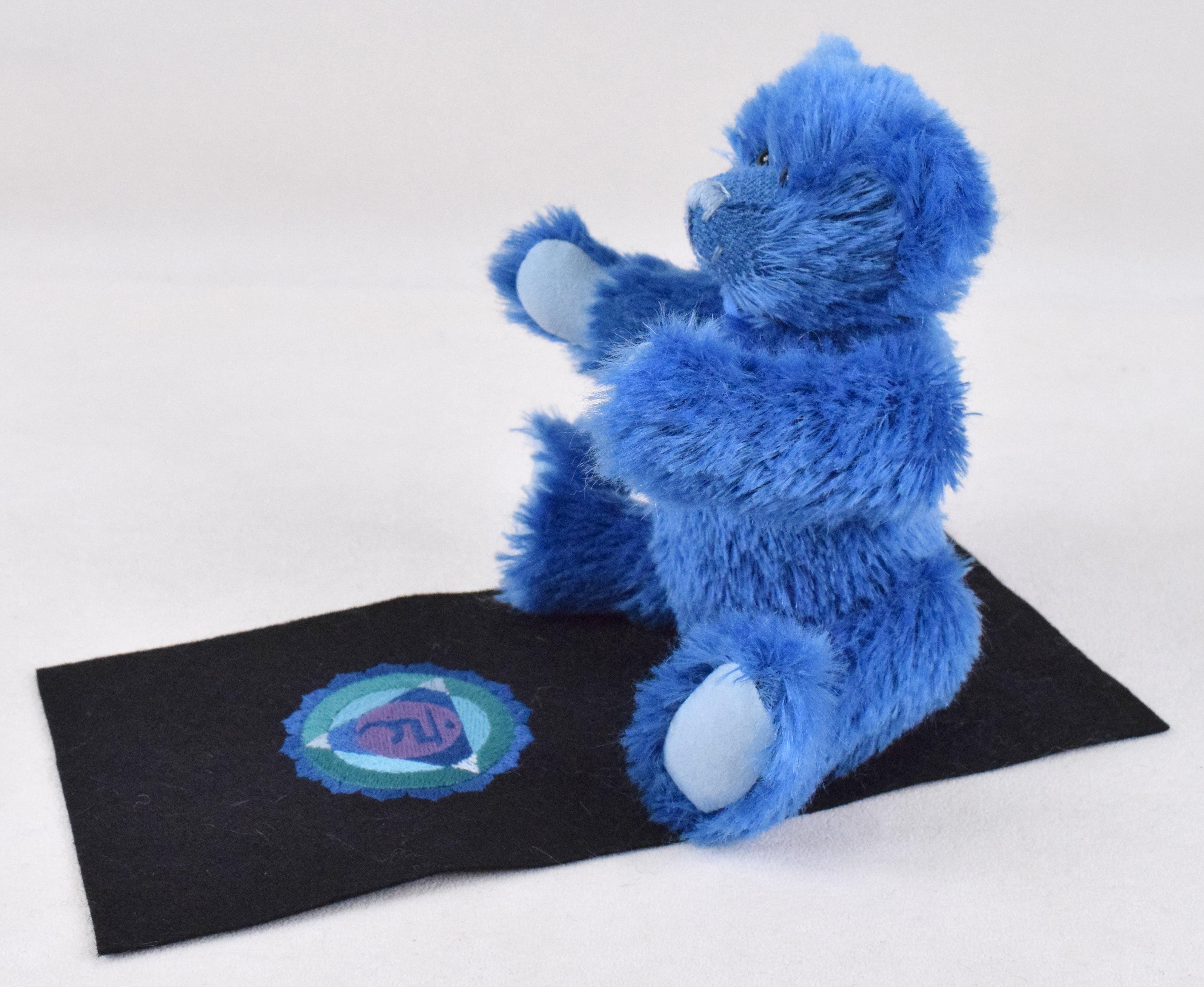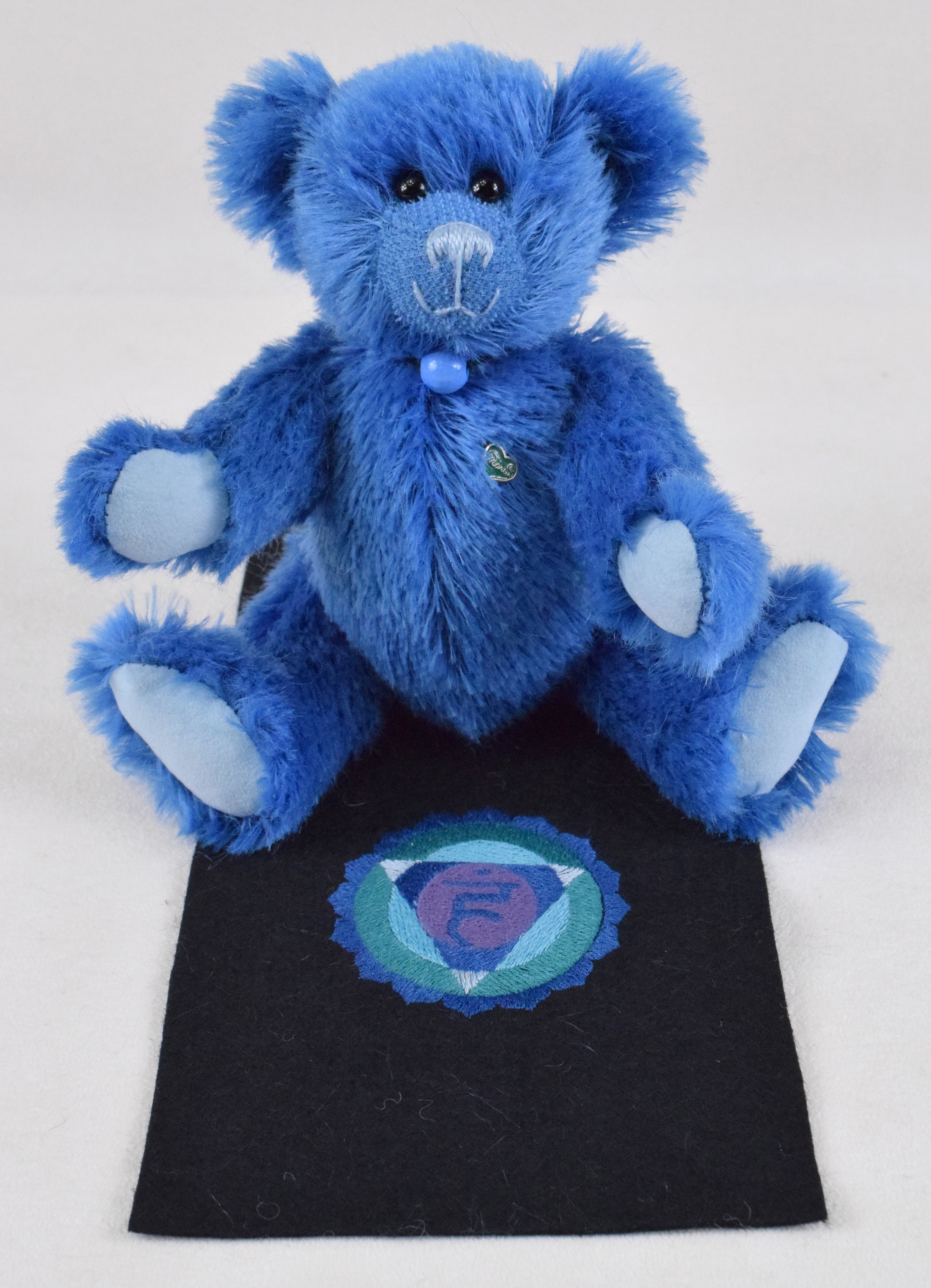 Das blaue Halschakra-Bärchen ist 21 cm groß. Es ist aus wunderschönem blauem Mohair gefertigt und trägt eine blaue Perle an der Stelle des Energiezentrums (direkt am Hals). Es sitzt auf einer edelen schwarzen Filzmatte, die mit dem Halschakra-Symbol bestickt wurde. Das Chakrabärchen ist weltweit auf 99 Stück limitiert.