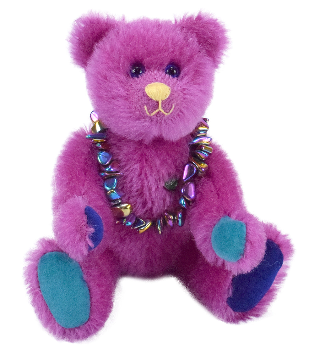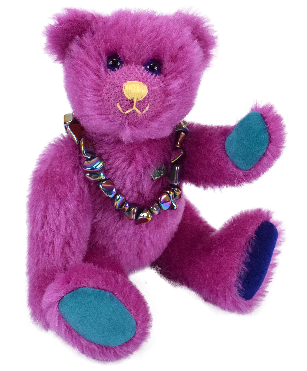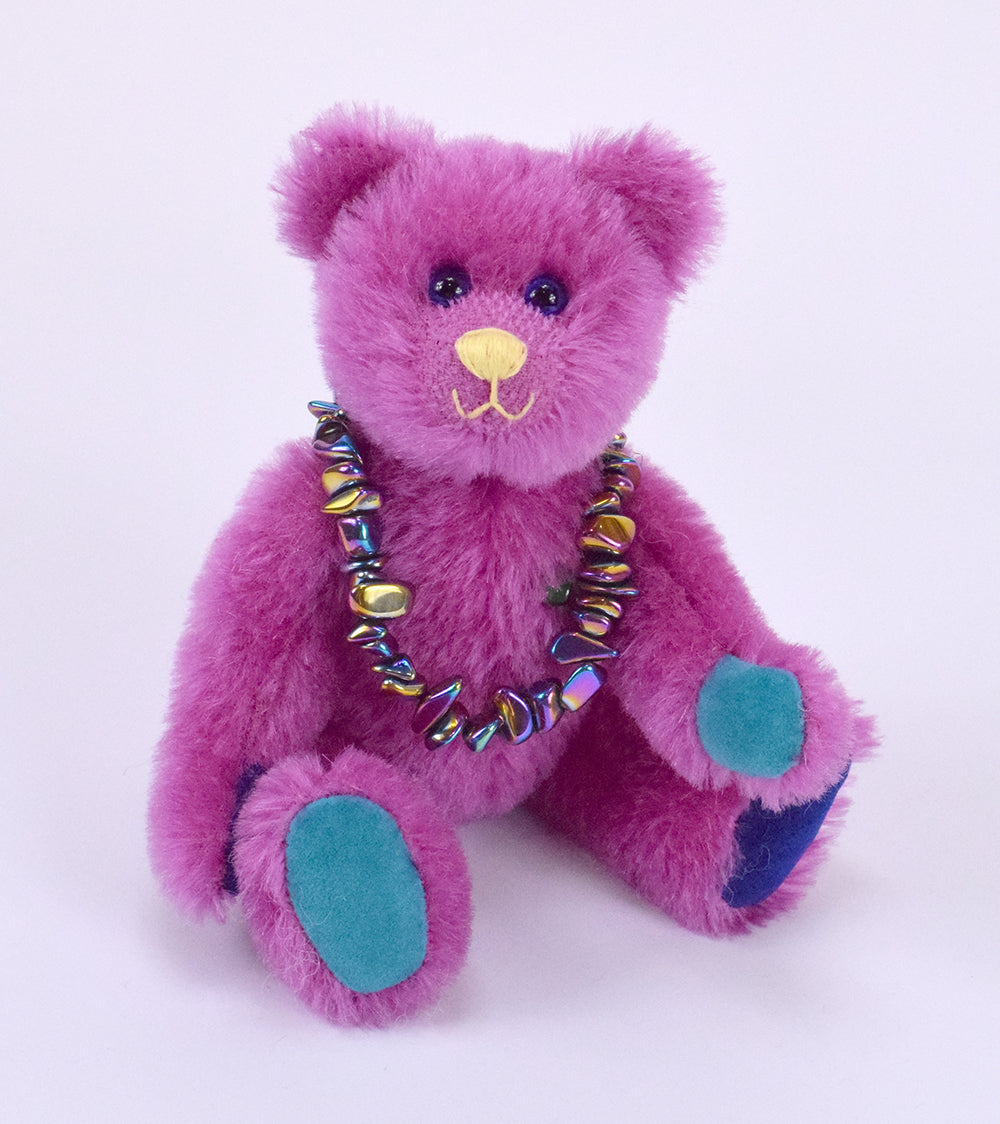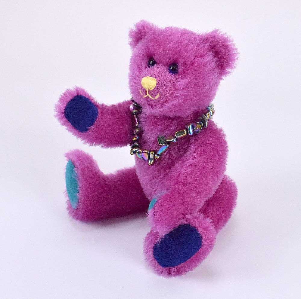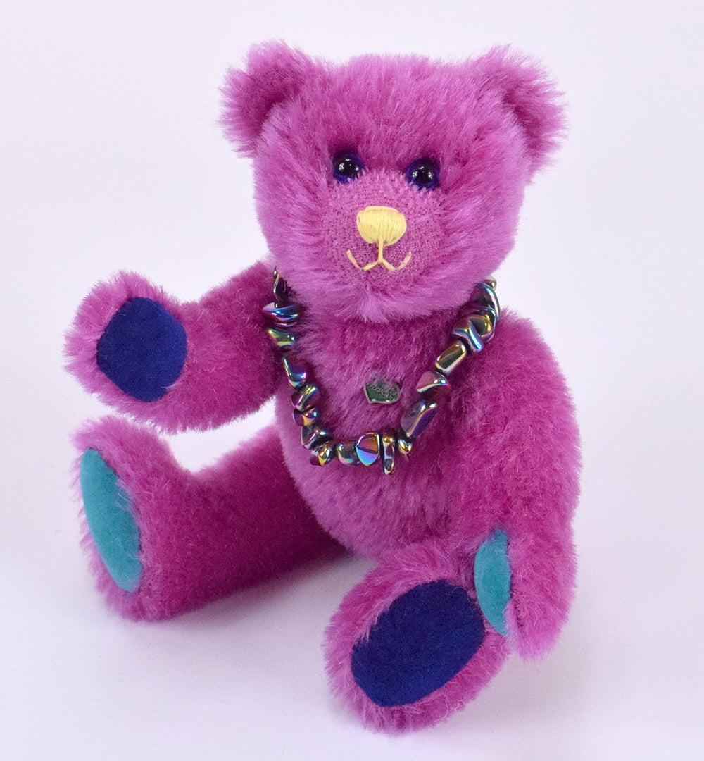 Um seinen Hals trägt der kleine Bär ein Regenbogen-Hämatit-Armband, das in vielen Farben schimmert und je nach Lichteinfall immer wieder neue Facetten zeigt. Der Hämatit gilt als Stein der Stärke, der Mut, Schutz und innere Ruhe schenken soll – perfekt für einen treuen, kleinen Begleiter.